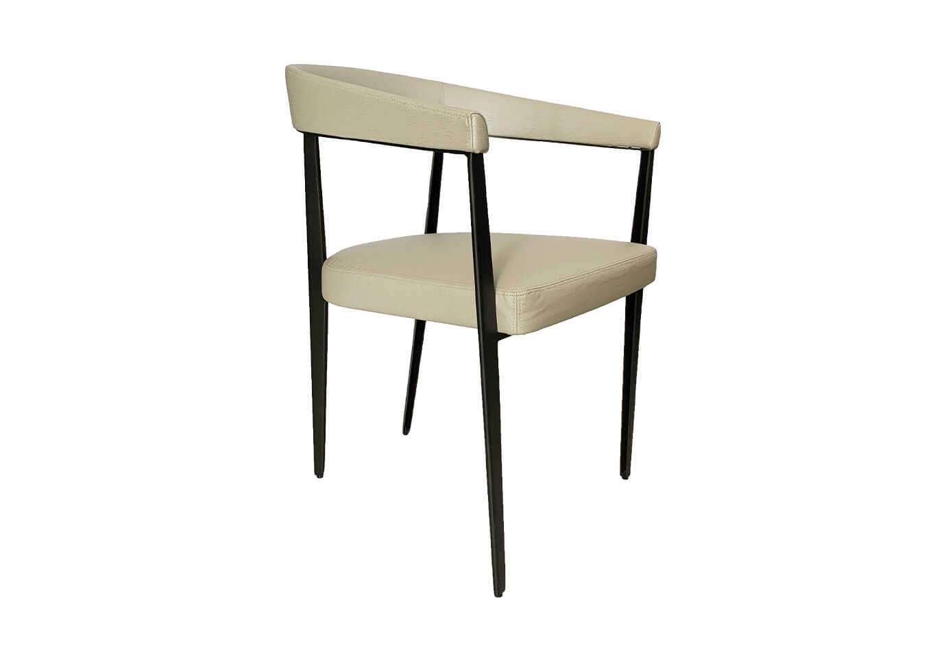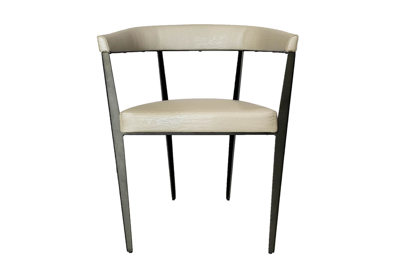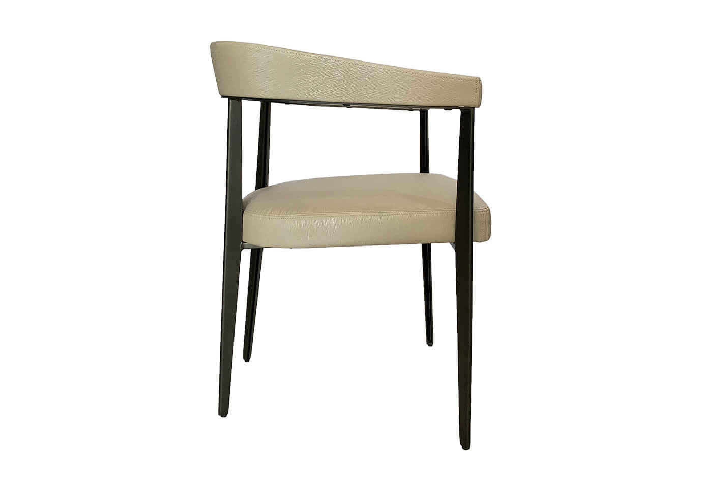 Silla con descanza brazos tapizada en vinipiel beige con textura y ligero brillo, estructura en acero color negro.