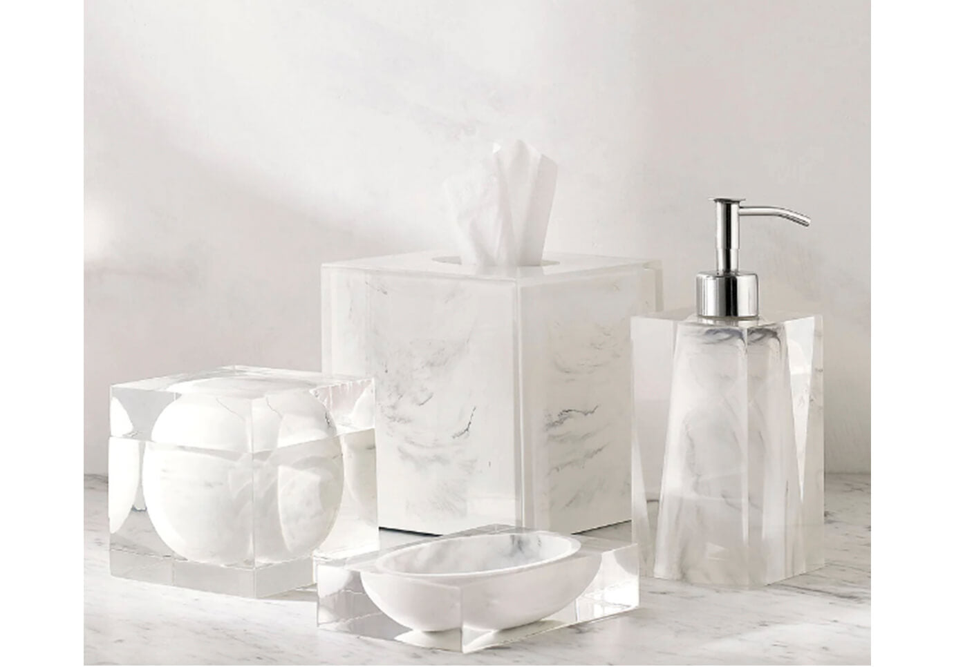 Adorne su spa con nuestros accesorios de baño marmoleado blanco. Elaborados con resina inyectada con tinta que flota a la perfección en una cubierta acrílica translúcida, estos accesorios completan un baño que irradia textura y un atractivo moderno.