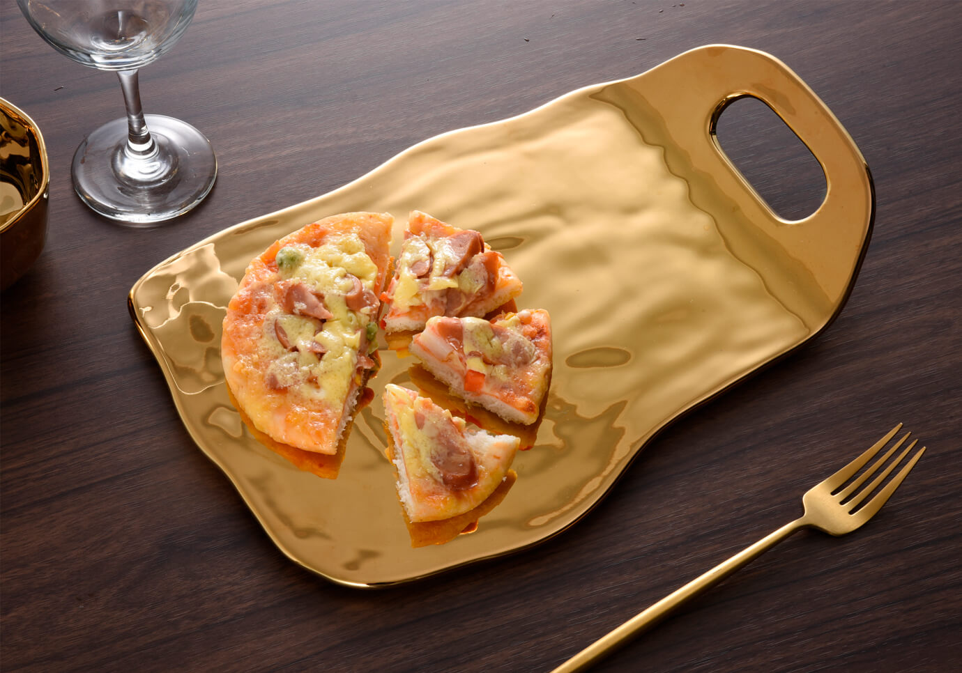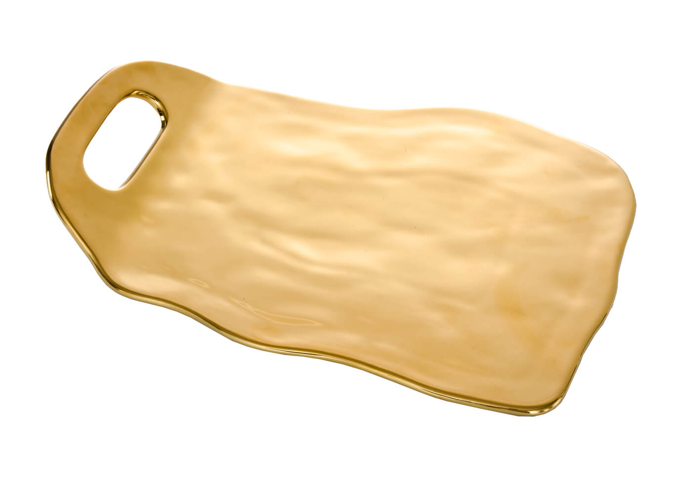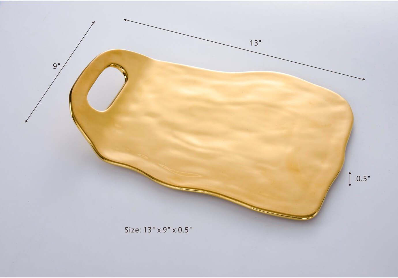 Ya sea una tabla de embutidos para dos o postres para unos pocos, esta bandeja tiene el tamaño ideal para todas las fiestas informales. Deslice esta bandeja en el refrigerador para enfriar y mantener todas sus porciones frescas y sabrosas. Llamativa y elegante porcelana de alto fuego con acabado titanio dorado. Apto para alimentos, apto para lavavajillas, apto para horno hasta 550°. Cuidado fácil.