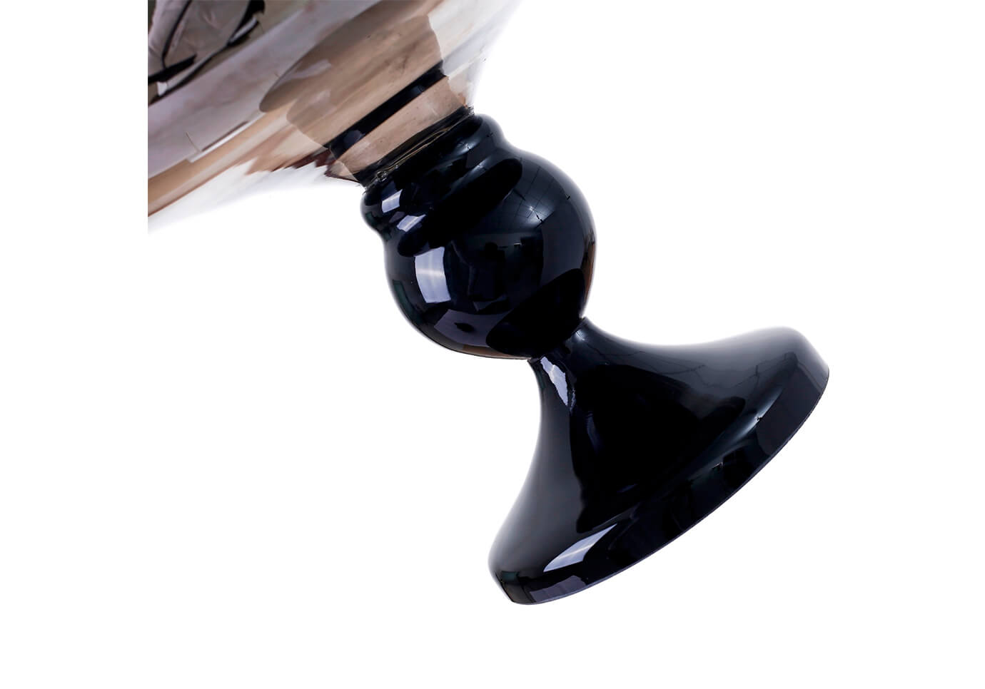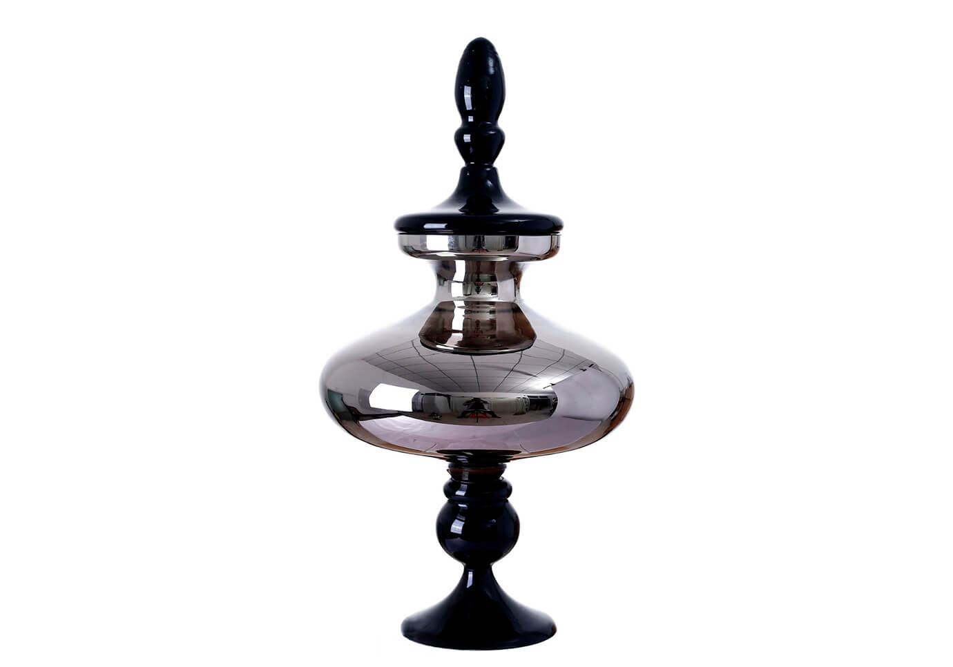 Bombonera de vidrio humo acabado espejo, pedestal y tapa chupón obscuro