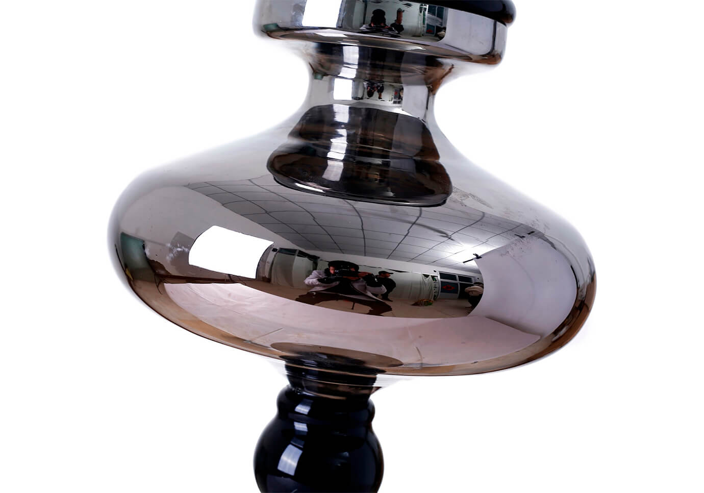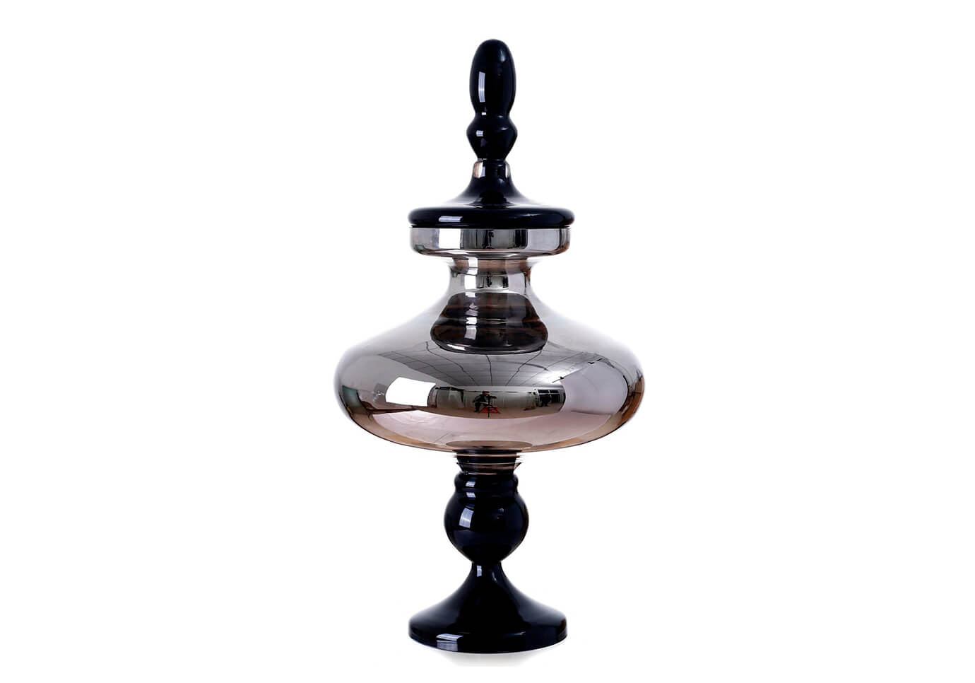 Bombonera de vidrio humo acabado espejo, pedestal y tapa chupón obscuro