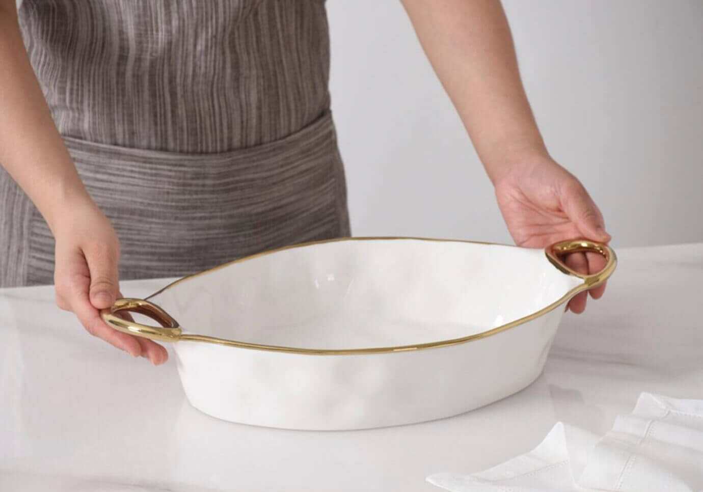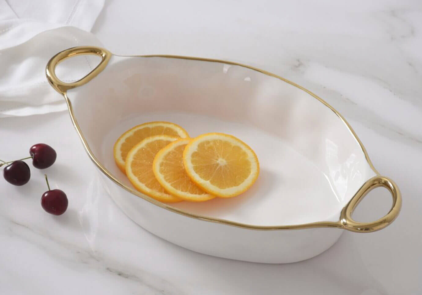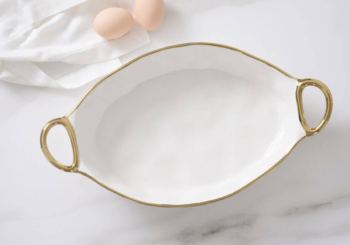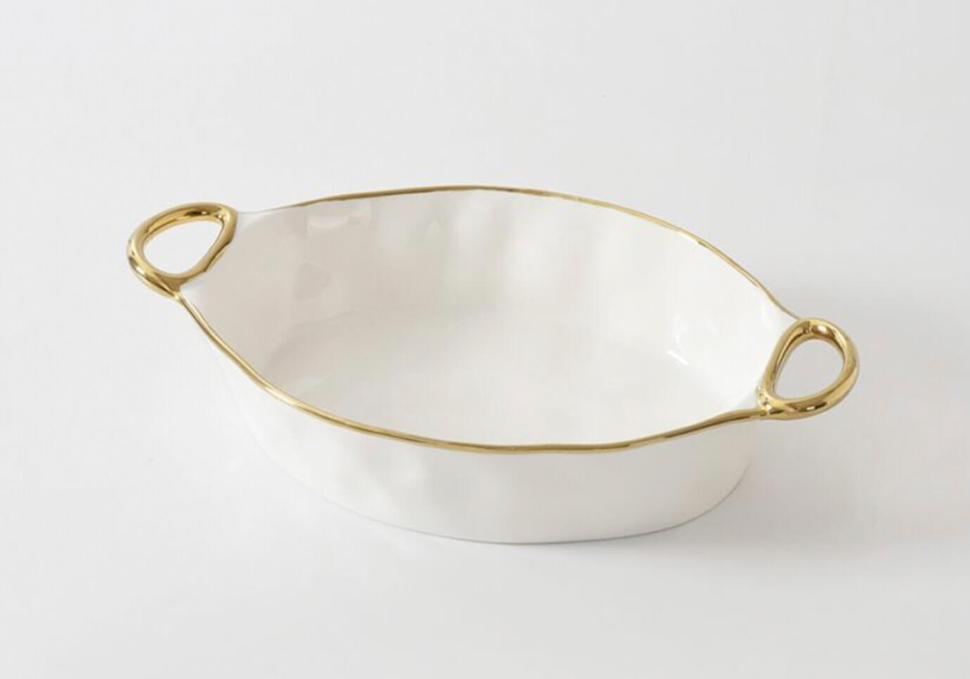 Platon Hondo de Cerámica Ovalado Blanco y Asas Doradas