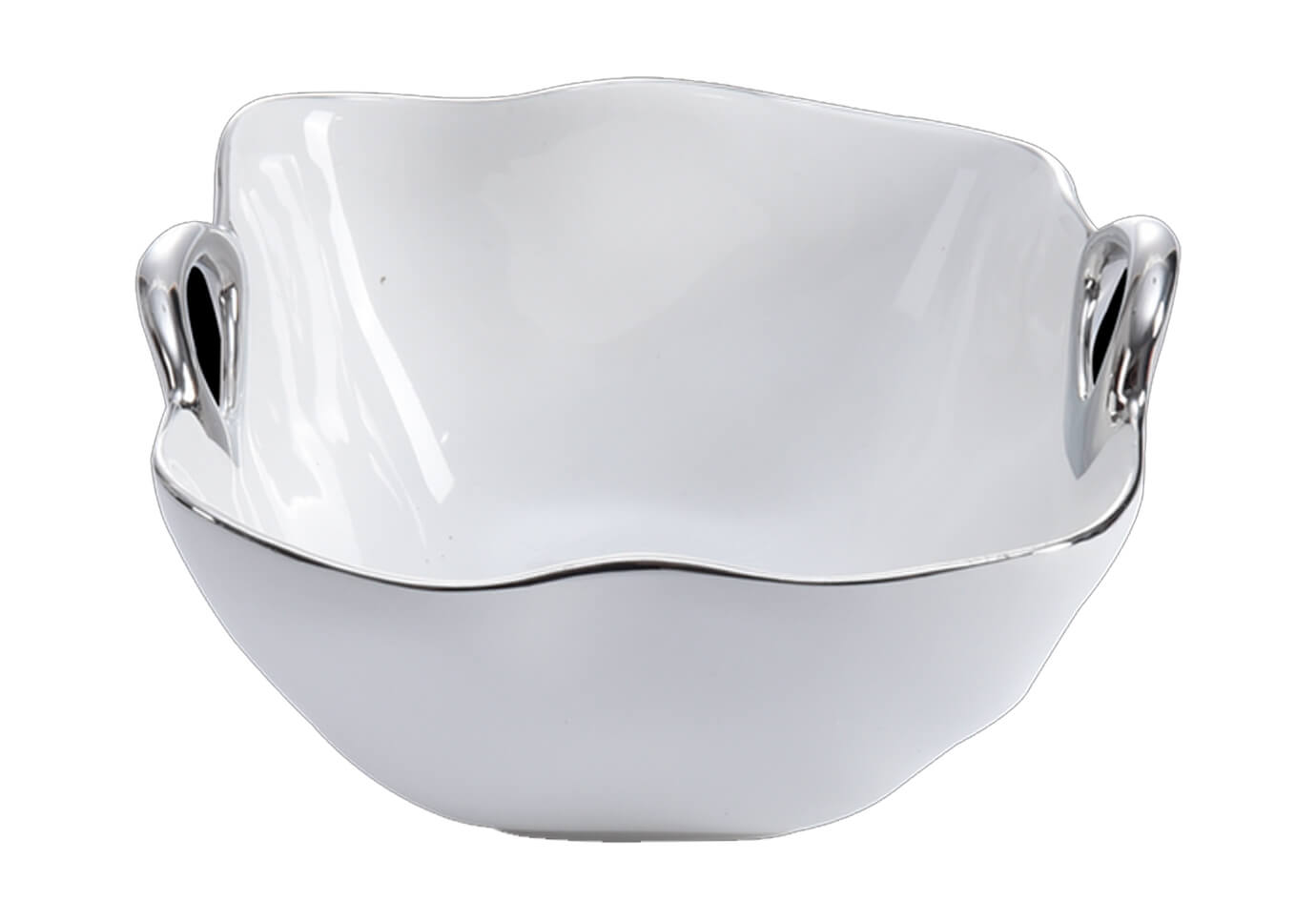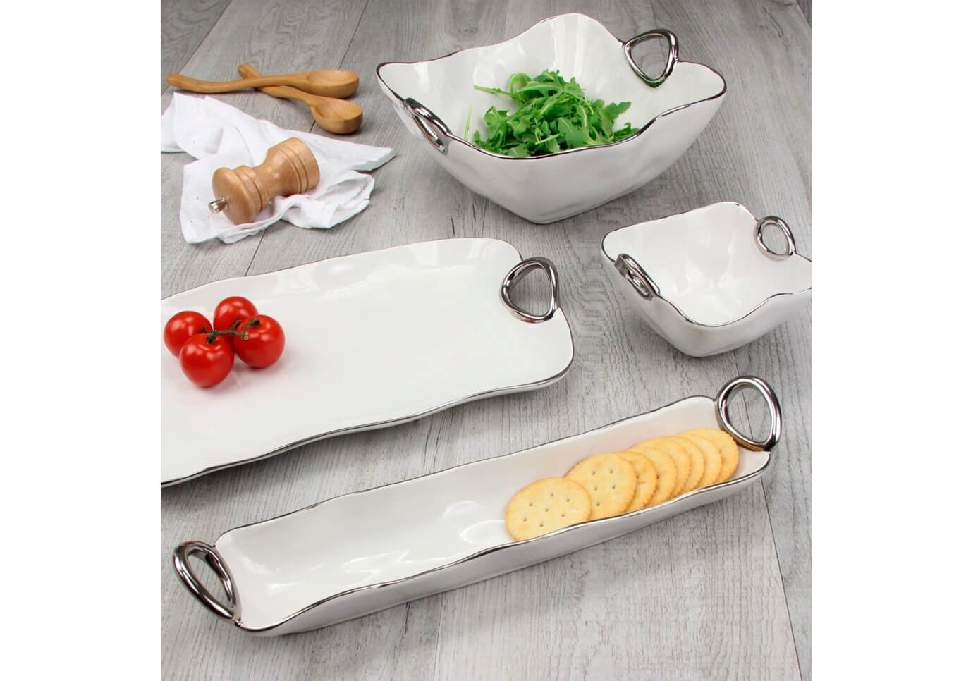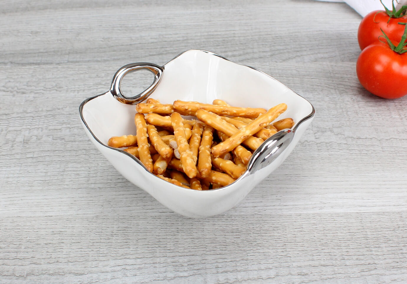 Cuenco para aperitivos con asa con estilo. Genial para bocadillos pequeños o en un buffet para condimentos. Impresionante porcelana blanca con mangos suaves y fluidos en titanio plateado. Apto para alimentos, apto para lavavajillas, apto para horno hasta 550°. Cuidado fácil.