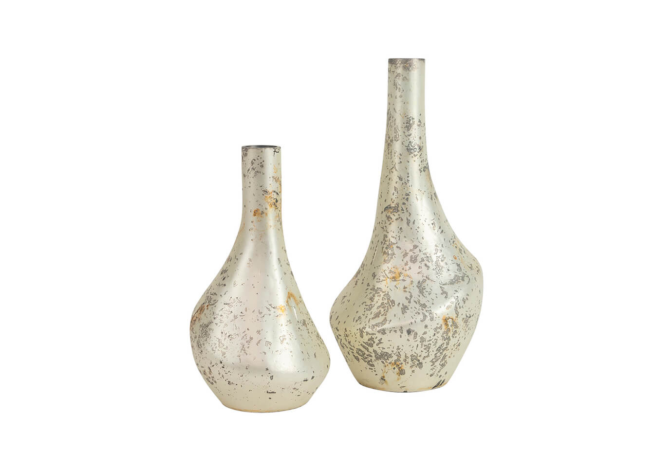 ¡Una obra de arte como ninguna otra! Este conjunto único de botellas de vidrio acabado jaspeado mate de cuello delgado.