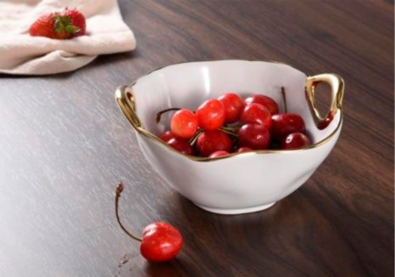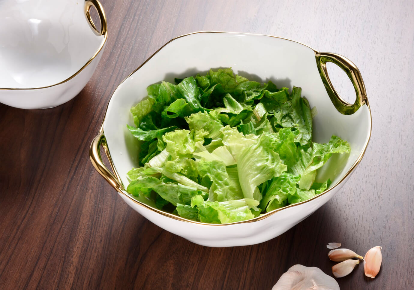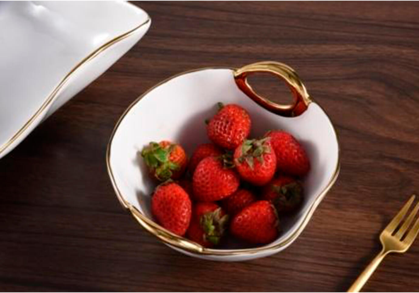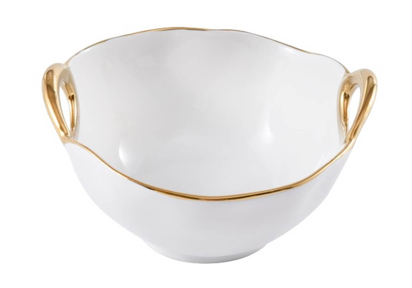 Bowl en asas doradas. Recipiente para servir pequeños bocados o en un buffet para condimentos hasta ensaladas, pastas o guarniciones. Impresionante porcelana blanca con mangos suaves y fluidos en titanio dorado. Apto para alimentos, apto para lavavajillas, apto para horno hasta 550°. Cuidado fácil.