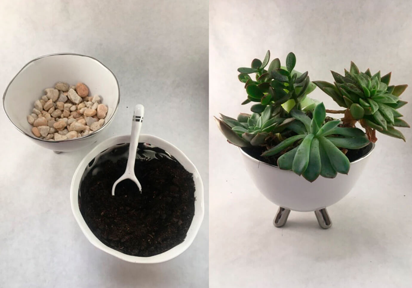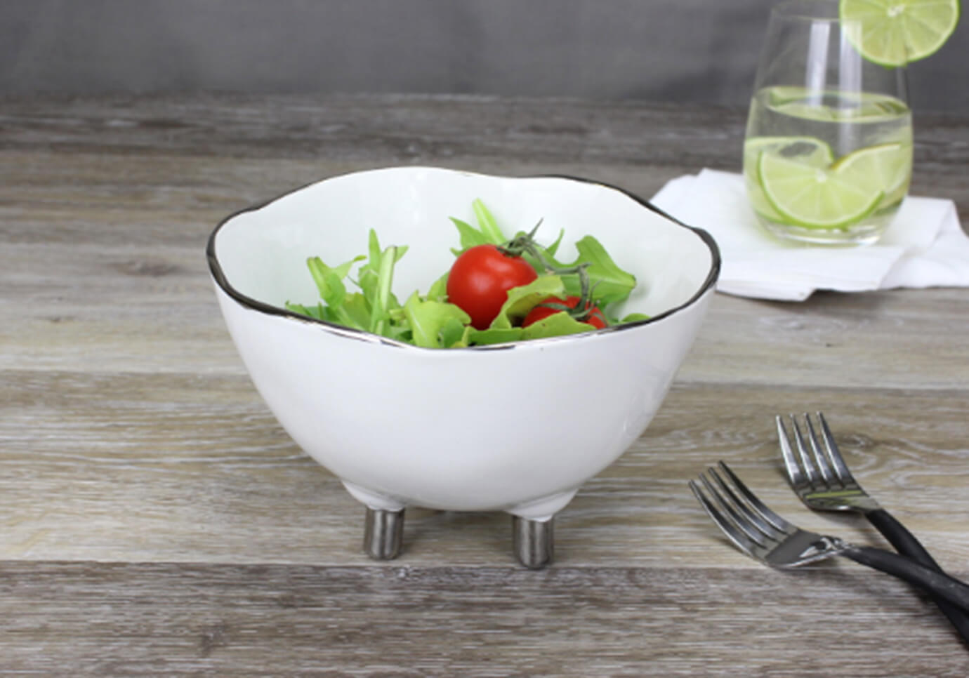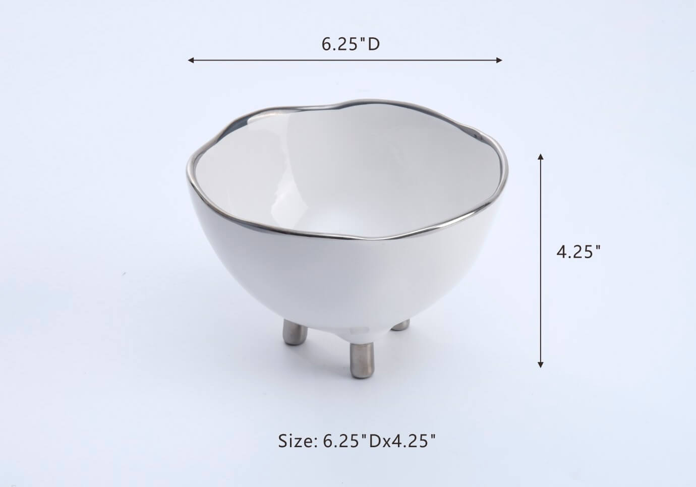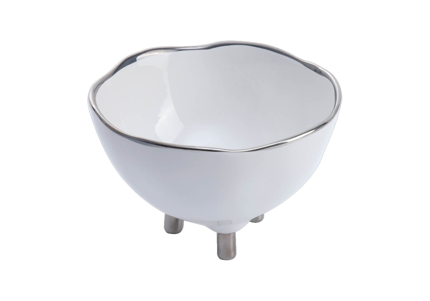 Cuenco irregular de porcelana blanco con filo y patas plateado brillante