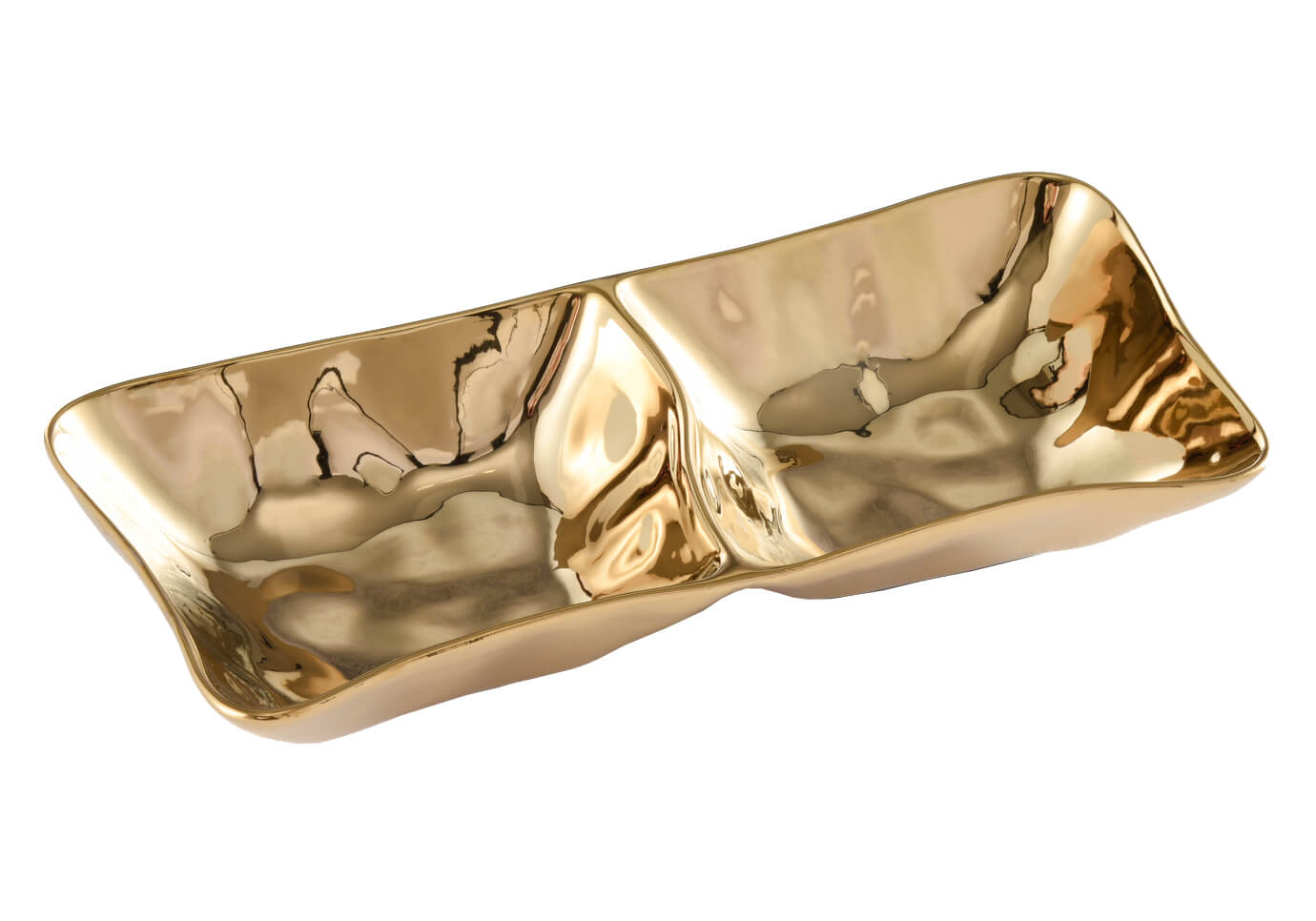 Ideal para servir aperitivos, postres y acompañamientos. Sirva papas fritas y salsa, un surtido de galletas o un dúo de verduras. ¡Este servidor también es un plato de nueces y/o dulces perfecto para cualquier encimera! Llamativa y elegante porcelana de alto fuego con acabado titanio dorado. Apto para alimentos, apto para lavavajillas, apto para horno a 550°. Deslustre y sin manchas. Cuidado fácil.