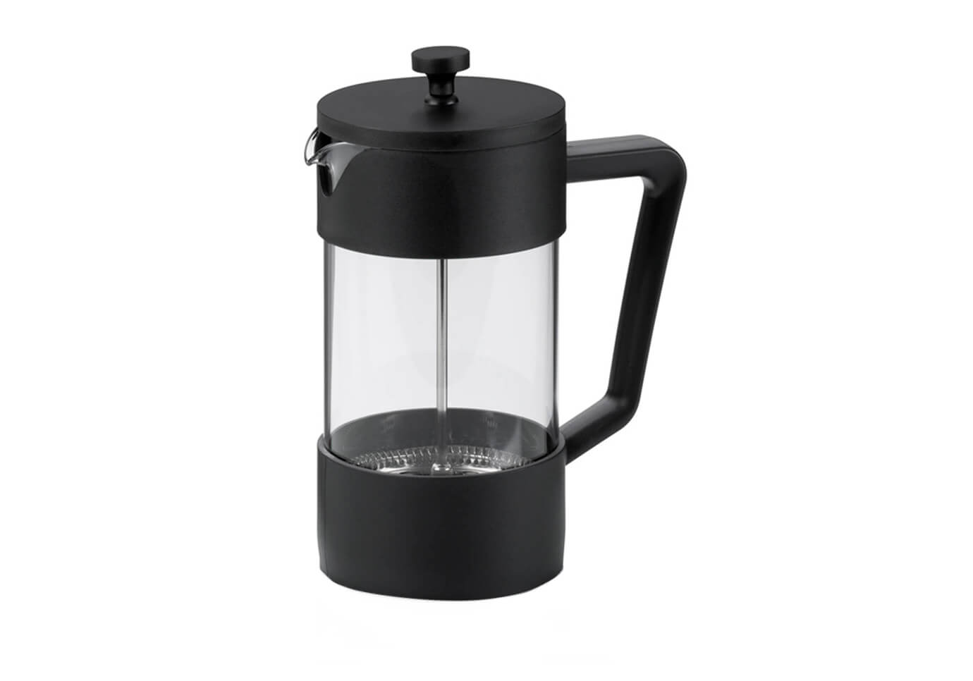 Cafetera negra con vidrio y prensa francesa de acero inoxidable.