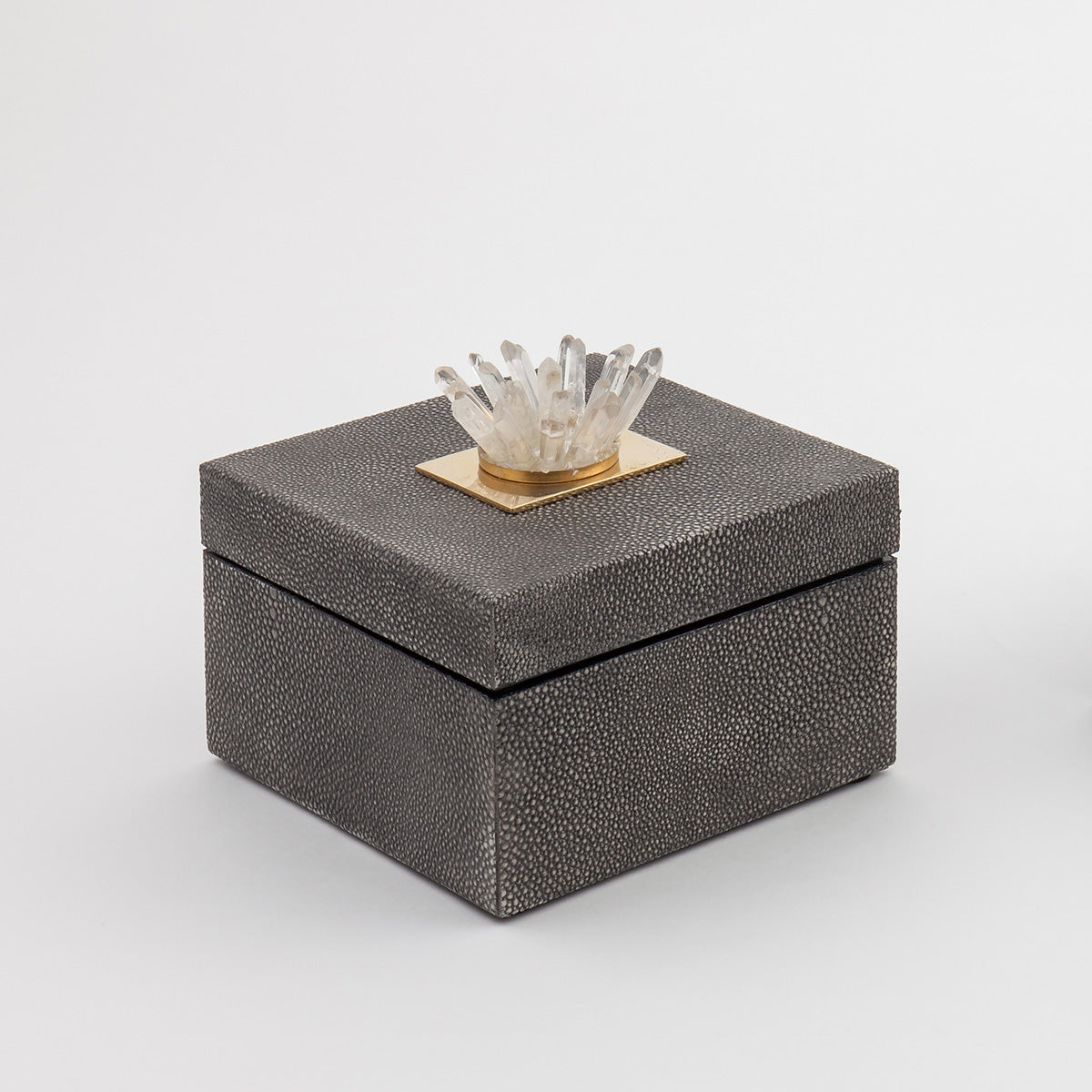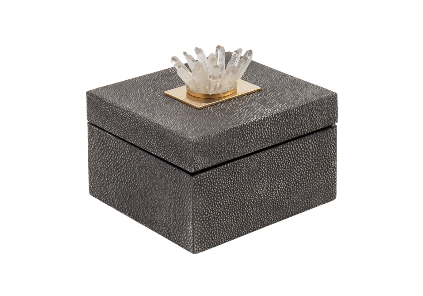 Caja decorativa cuadrada elaborada en madera con un acabado de vinipiel estilo mantarraya en color gris. Incluye un detalle superior de cuarzo transparente y acentos en latón dorado, que aportan un toque de elegancia.