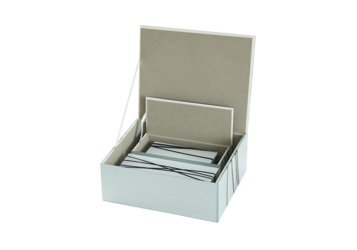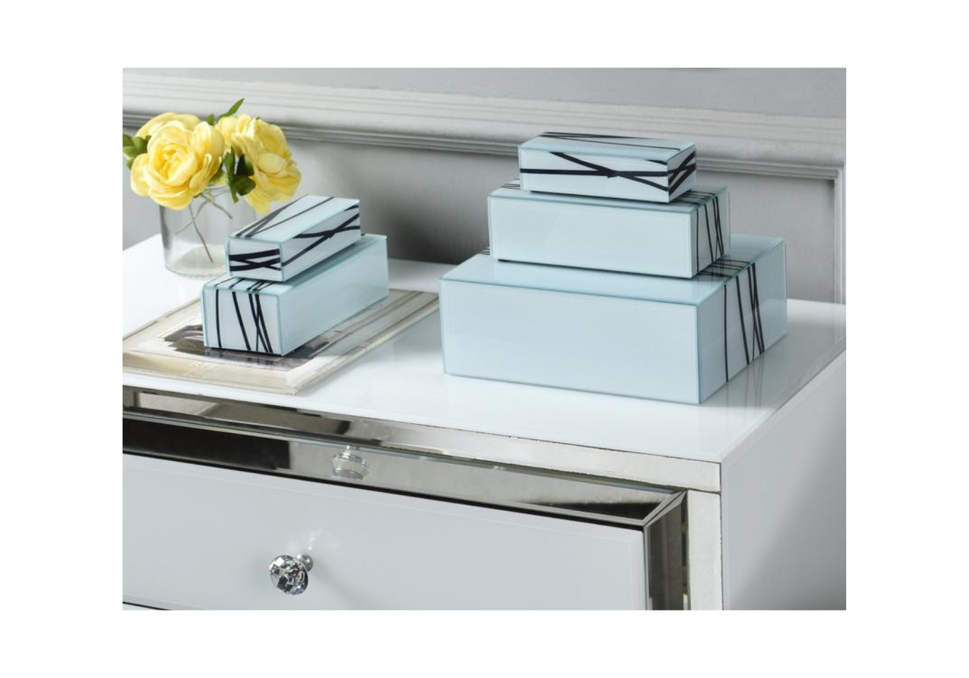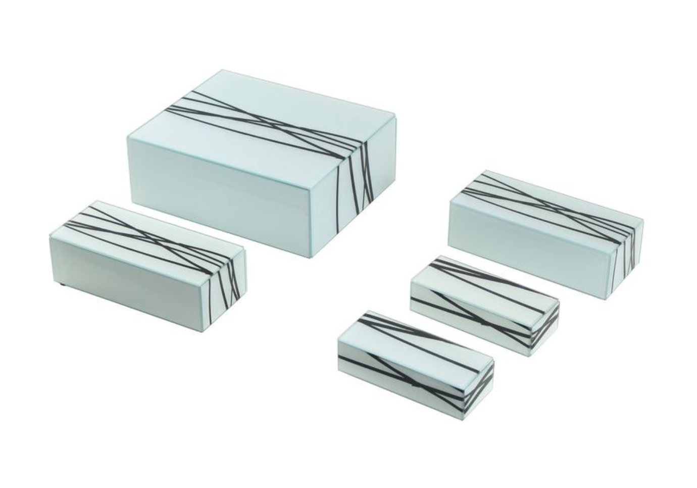 Dale un toque de elegancia y funcionalidad a tu espacio con estas cajas decorativas de vidrio en un sofisticado tono celeste, realzadas con delicados detalles de líneas negras. Perfectas para organizar pequeños objetos o como piezas decorativas, estas cajas combinan diseño contemporáneo y estilo atemporal.