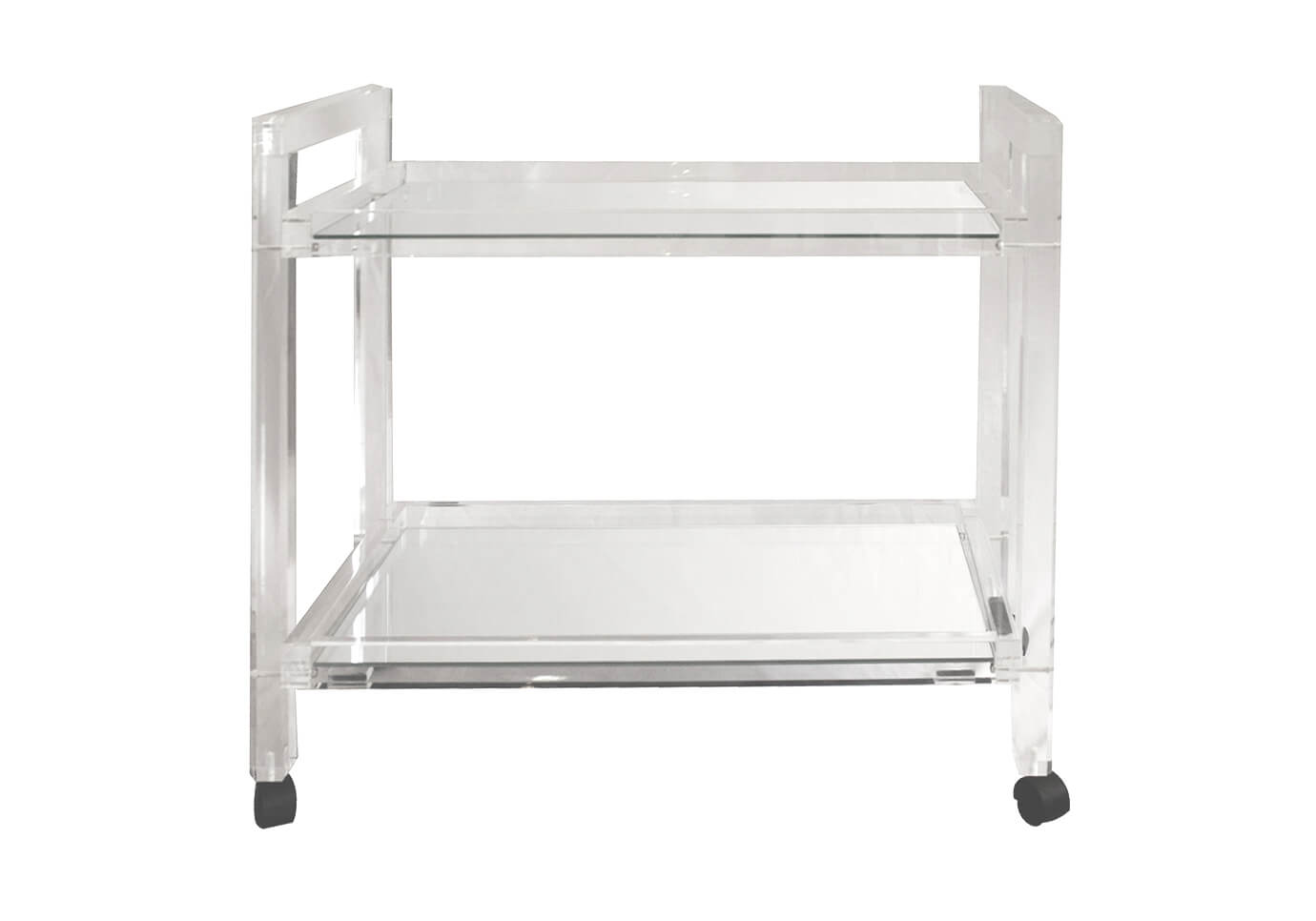 Carro de acrílico transparente de dos pisos, superficie inferior espejo natural y superior vidrio transparente.