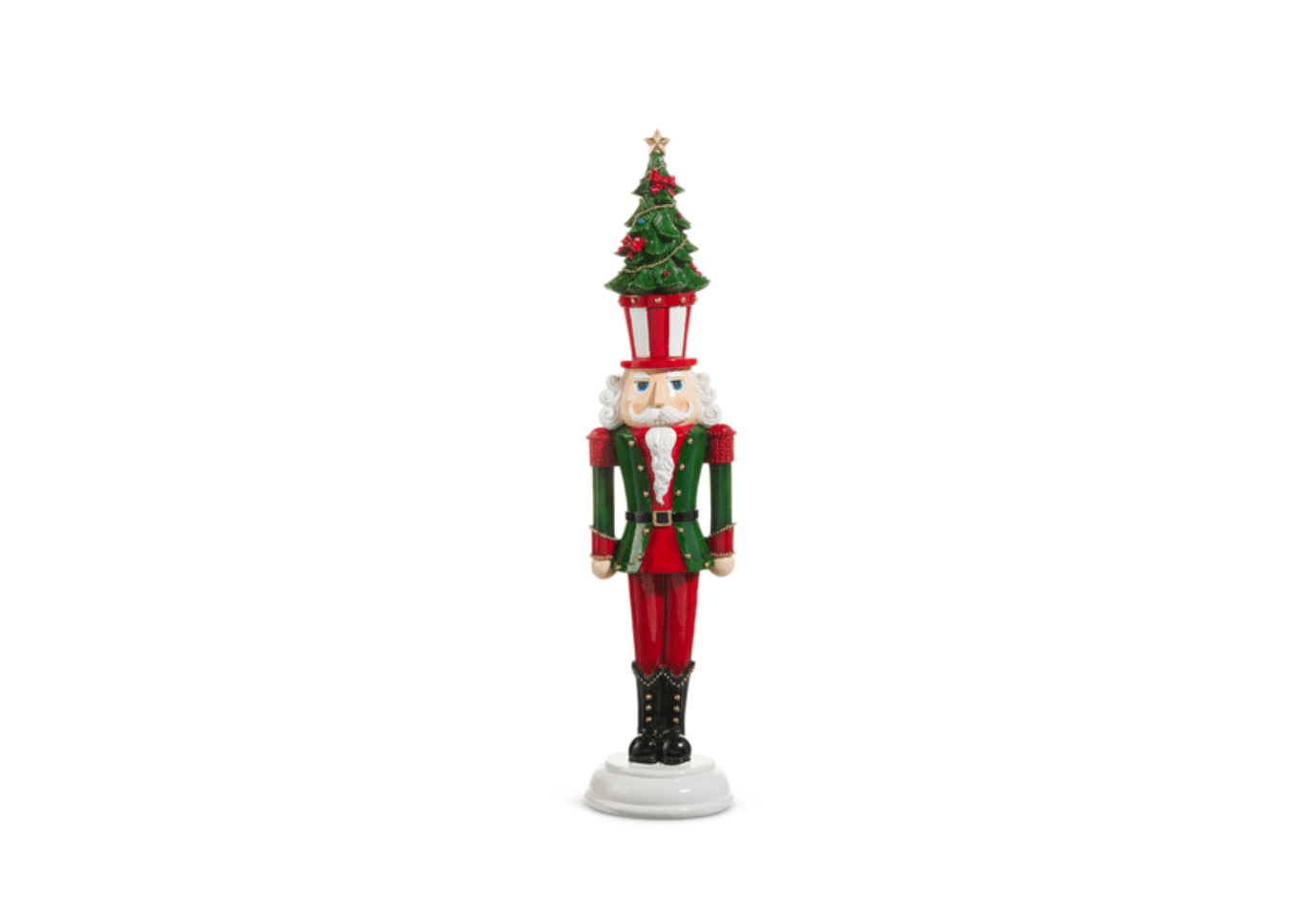 Cascanueces de resina verde, rojo y blanco con sombrero.