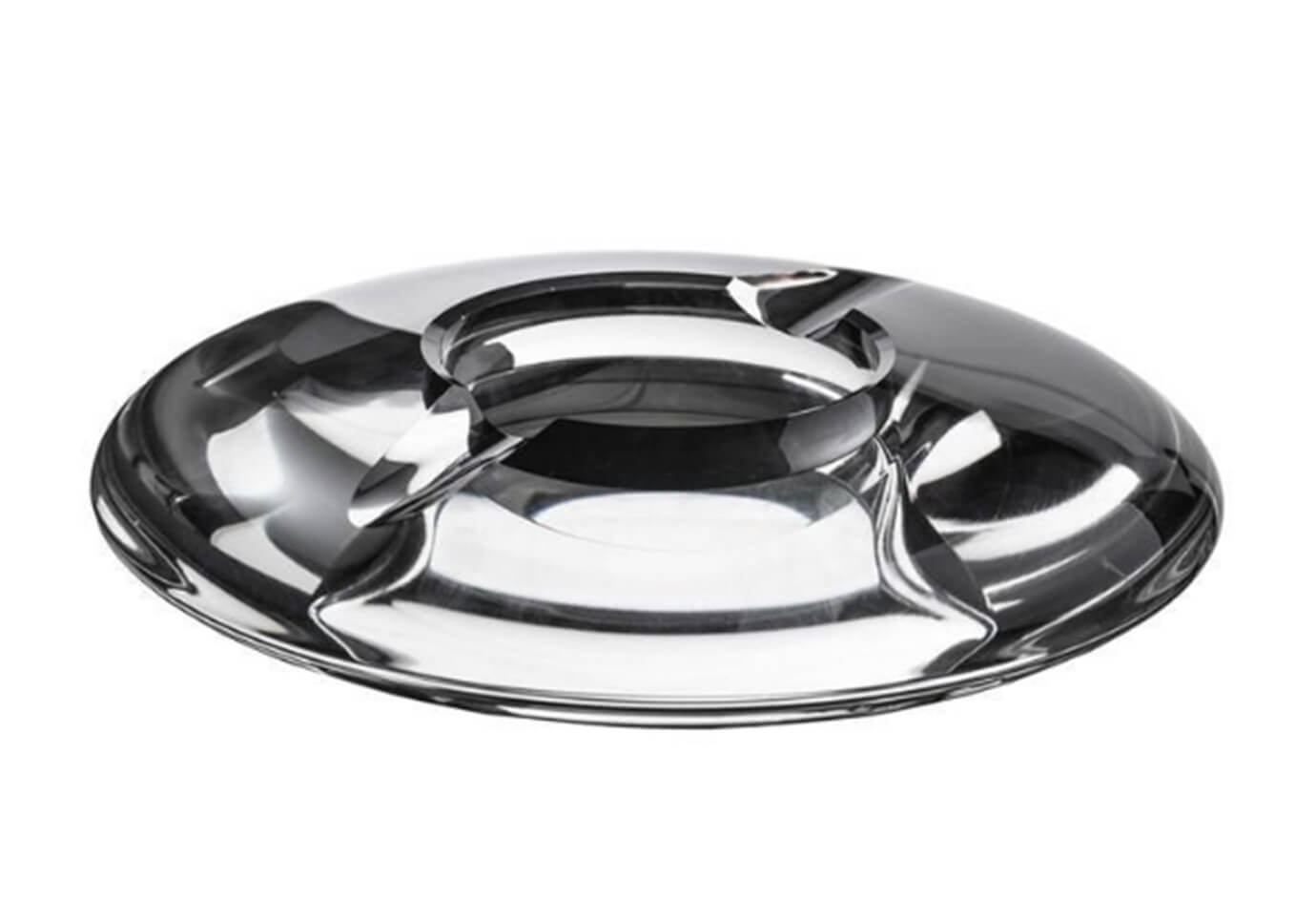 Cenicero de cristal solido transparente, circular redondeado espacio al centro con dos descansos.