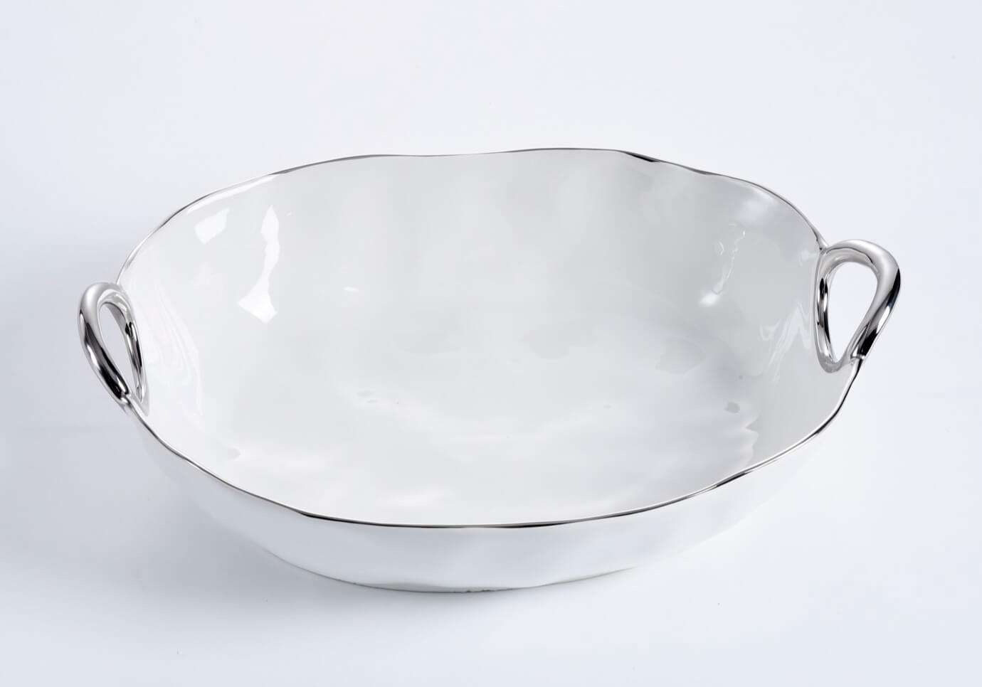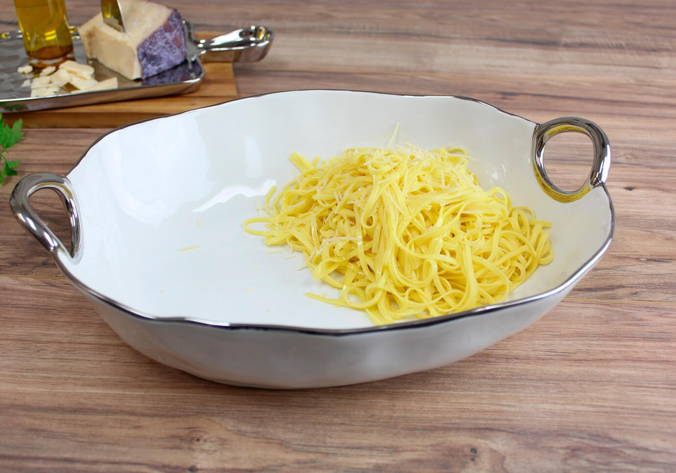 Su amplia forma hace que esta pieza sea ideal para servir entradas o aperitivos. Los espárragos, las zanahorias, las judías verdes e incluso un pescado entero son impresionantes en esta pieza. Impresionante porcelana blanca con suaves y elegantes asas en titanio plateado. Alimentos seguros. Aptas para el lavavajillas. Apto para horno hasta 500°. Cuidado fácil.
