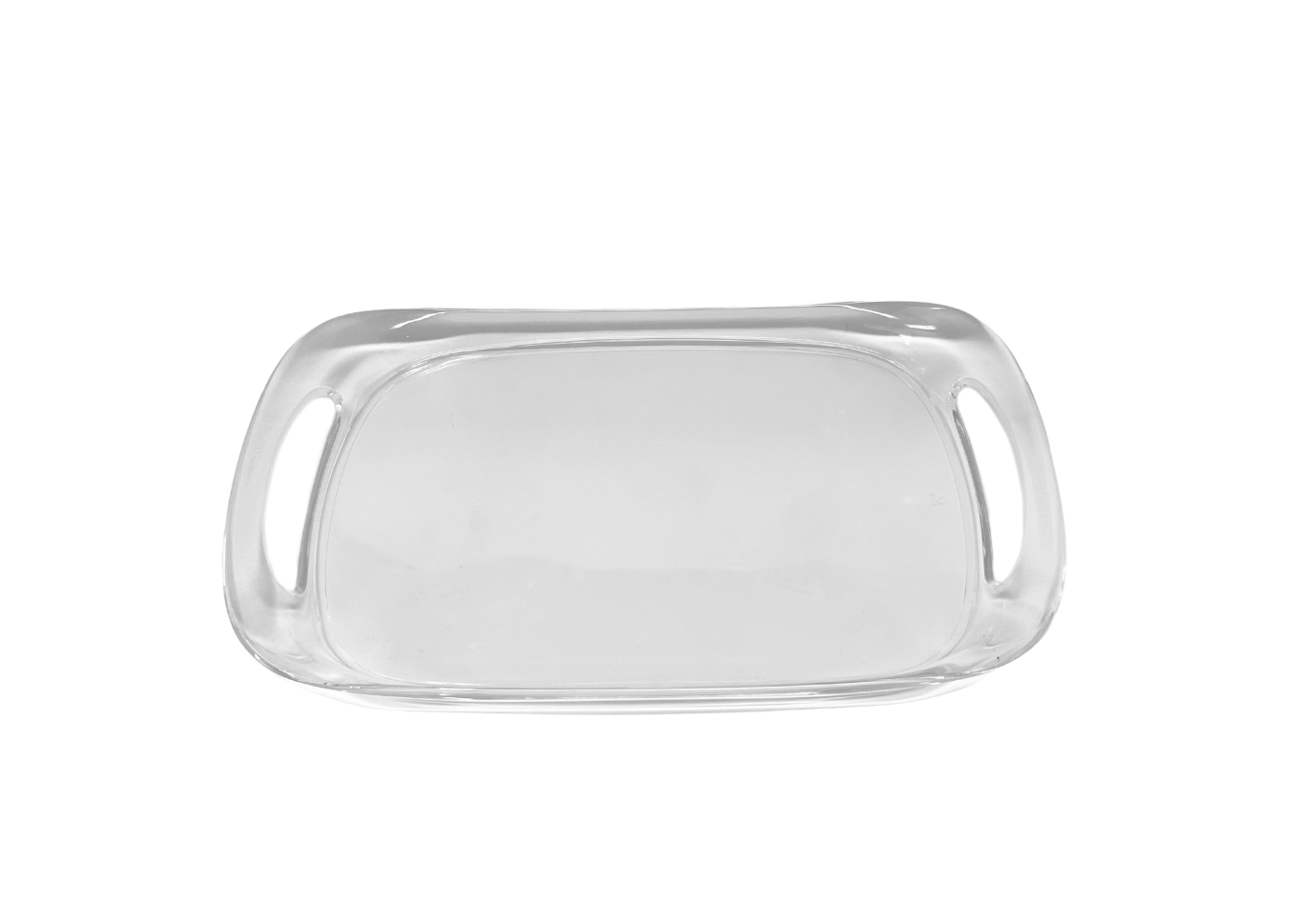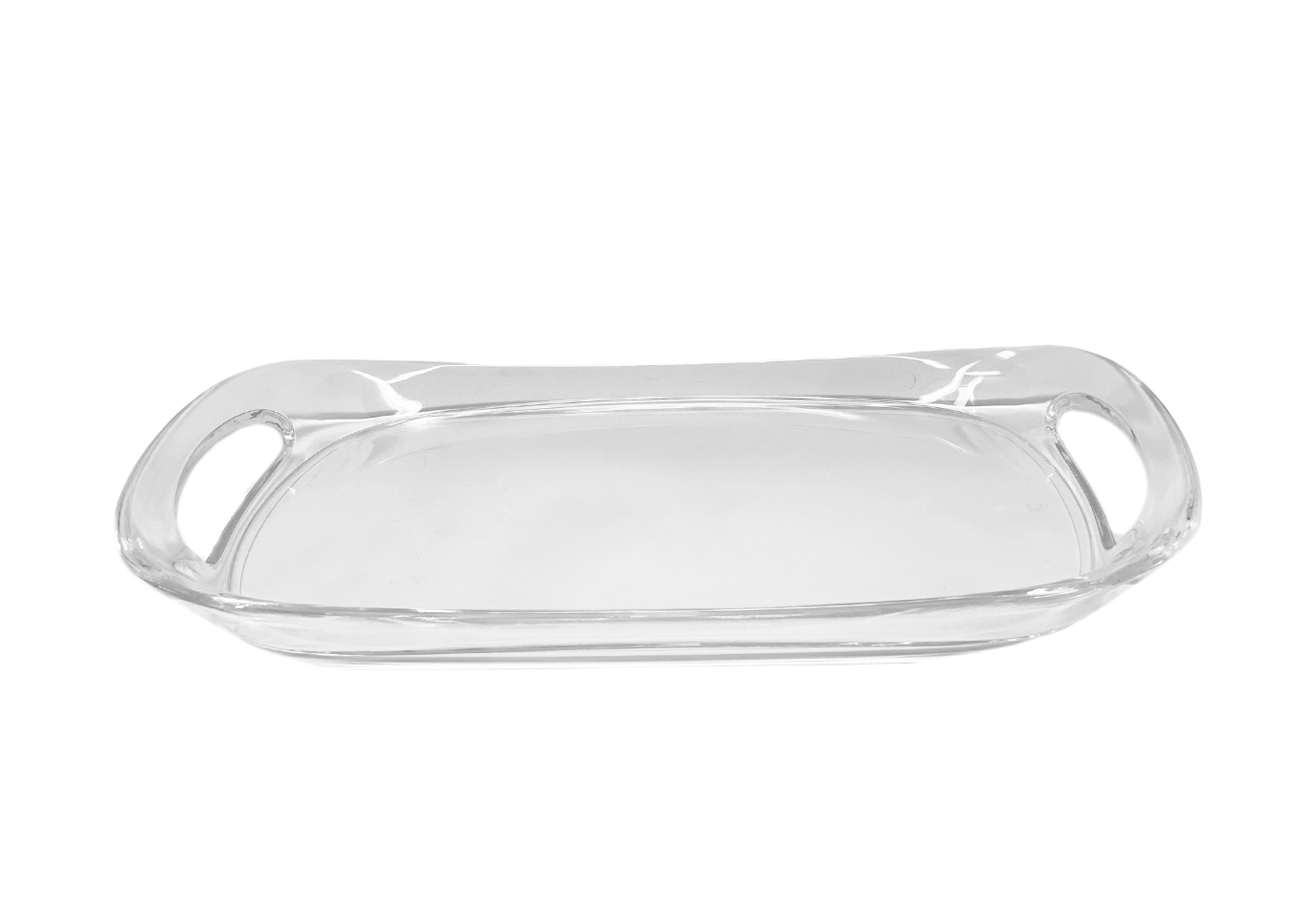 Charola de acrílico ovalada borde alto con huecos para agarraderas. Ligera y transparencia cristalina.