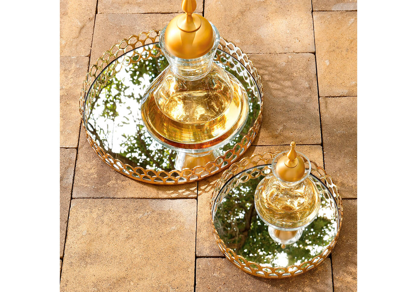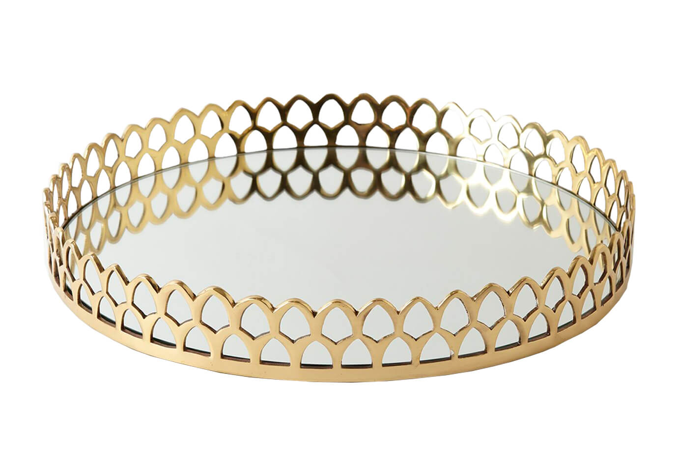 Charola Redonda Espejo Barandal Triángulos Metal Dorado