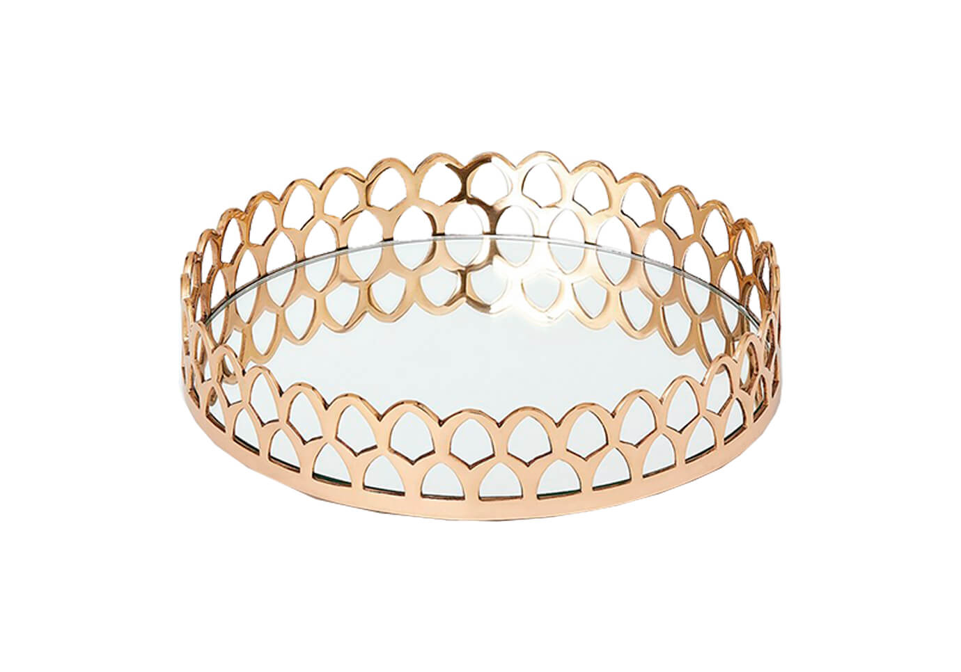 Charola redonda de espejo color natural con barandal diseño de triángulos de metal dorado brillante.
