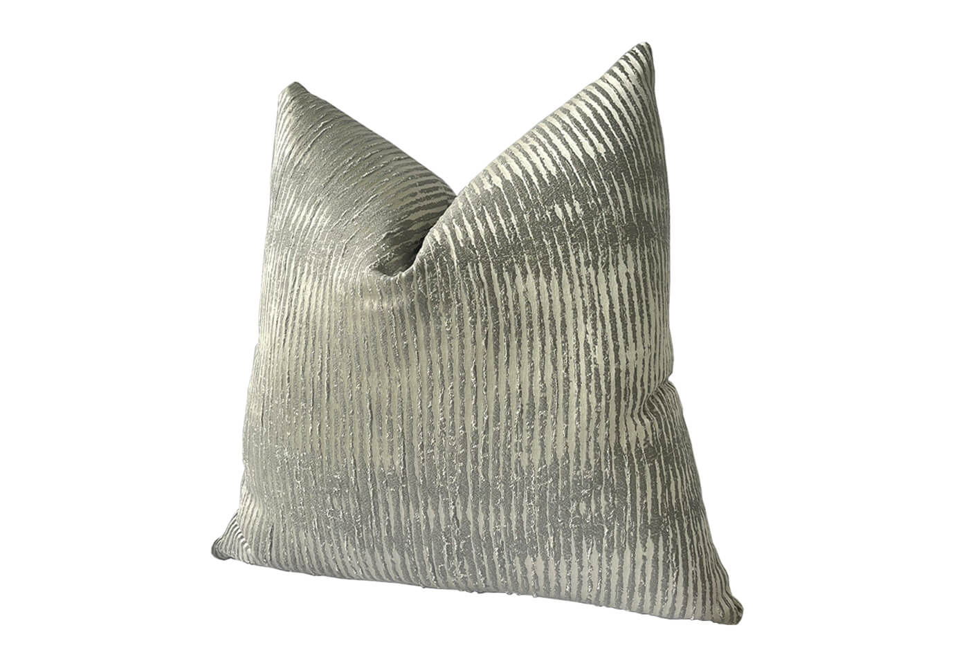 Cojín 100% pluma tela base ivory satinado y patrón franjas irregulares gris.