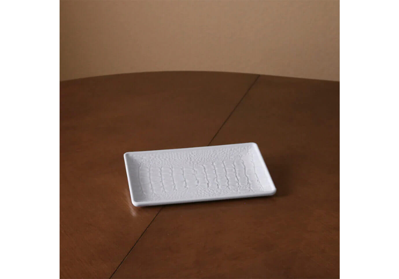 Fabricada con melamina de lujo con una textura clásica de cocodrilo, nuestra bandeja rectangular pequeña añade sofisticación instantánea dondequiera que se coloque. Una forma limpia y moderna y una textura robusta se combinan para lograr un efecto espectacular en esta elegante bandeja de melamina de lujo.