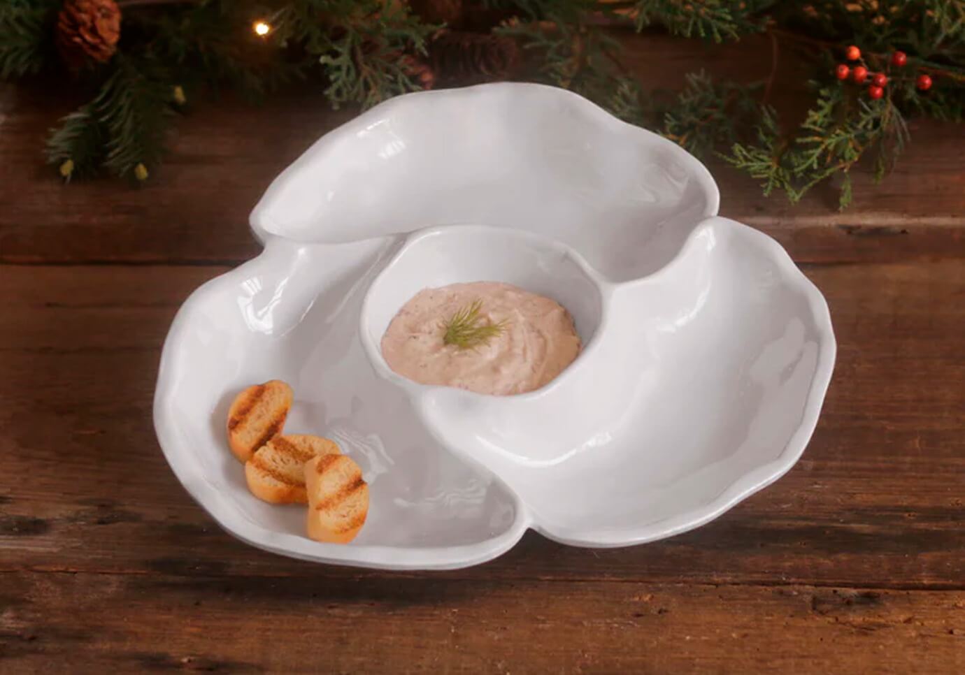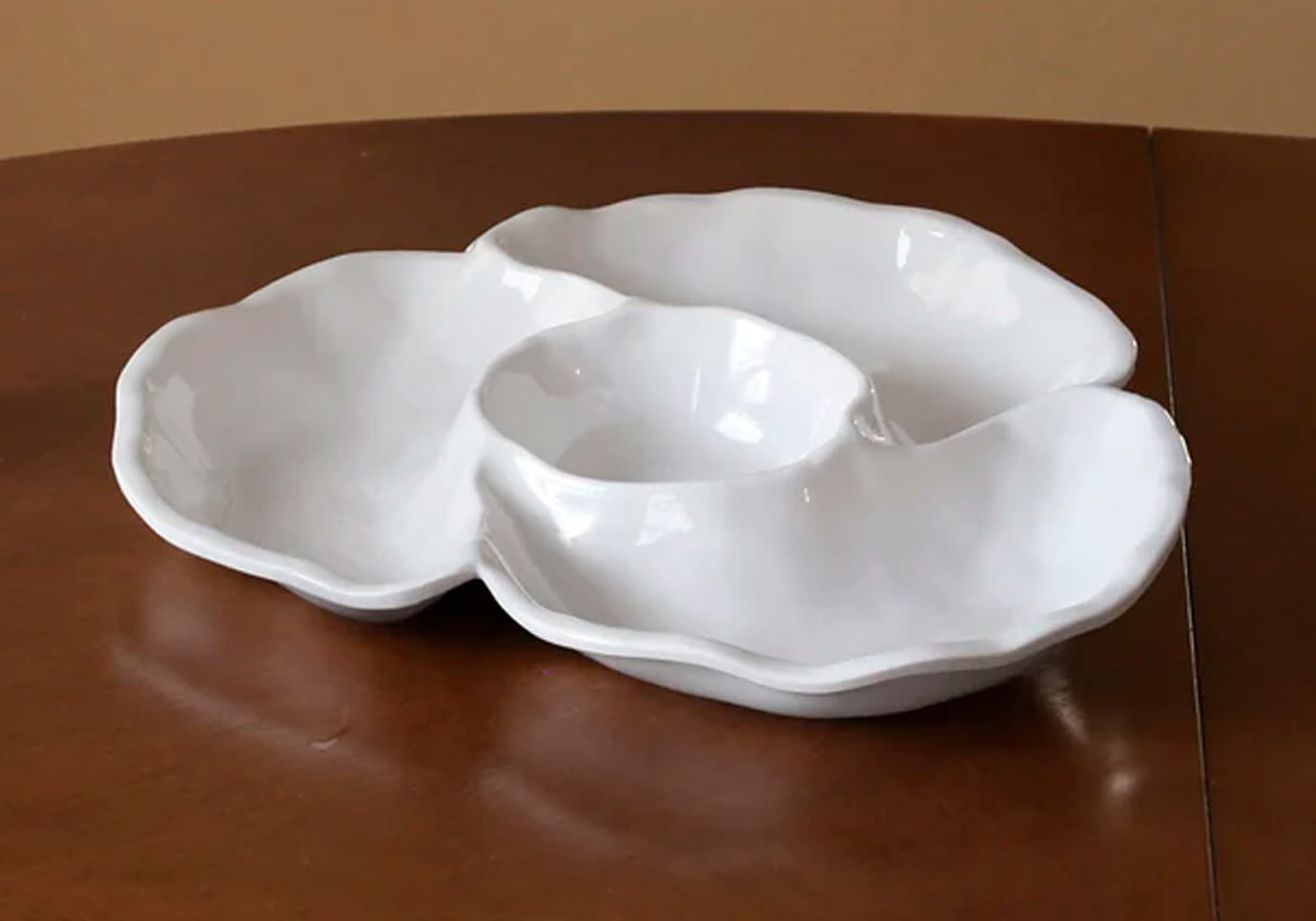 Inspirado en las formas fluidas de las formas orgánicas y fabricadas con melamina, Triple Dip (blanco) es un hermoso diseño que refleja muchas de las tendencias de estilo de vida más actuales. Esta elegante pieza dividida triplica las posibilidades de servir y se adapta perfectamente a espacios pequeños.