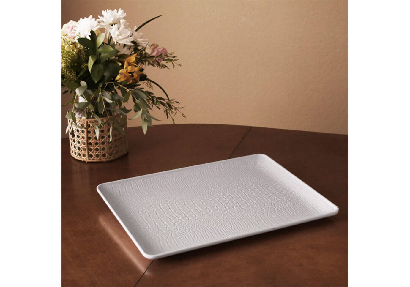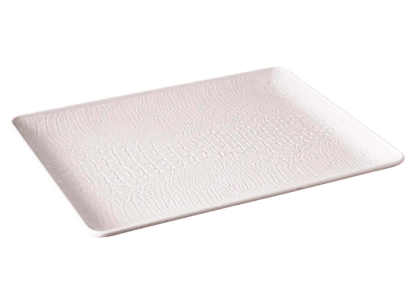 Fabricada con melamina de lujo con una textura clásica de cocodrilo, nuestra bandeja rectangular grande VIDA Croc (blanca) agrega sofisticación instantánea al entretenimiento de su hogar. Una forma limpia y moderna y una textura robusta se combinan para lograr un efecto espectacular en esta elegante bandeja de melamina de lujo.