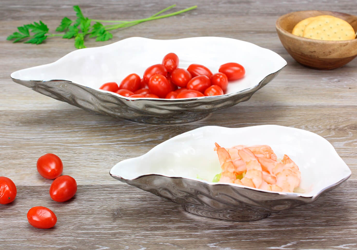 Cuenco en forma de ostra de porcelana blanca con exterior de titanio. La hermosa forma natural de una ostra en una combinación de colores atemporales y clásicas seguramente sorprenderá. Excelente para servir. ¡Úselo como un plato de salsa para mantequilla o salsa de soja para acompañar su comida de mariscos favorita! Llamativa y elegante porcelana de alto horno titanio plata con interior blanco reluciente.