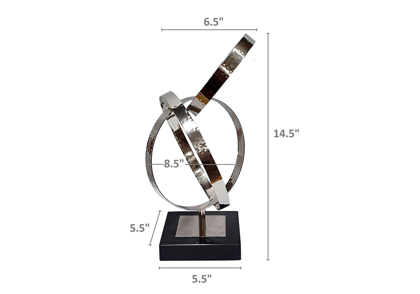 Lleve su diseño a nuevas alturas incorporando la elegante estatua en una habitación contemporánea. Los anillos de acero plateado se entrelazan mientras caen sobre una base cuadrada de mármol negro. Acentúe cualquier aparador contemporáneo en un comedor elegante.