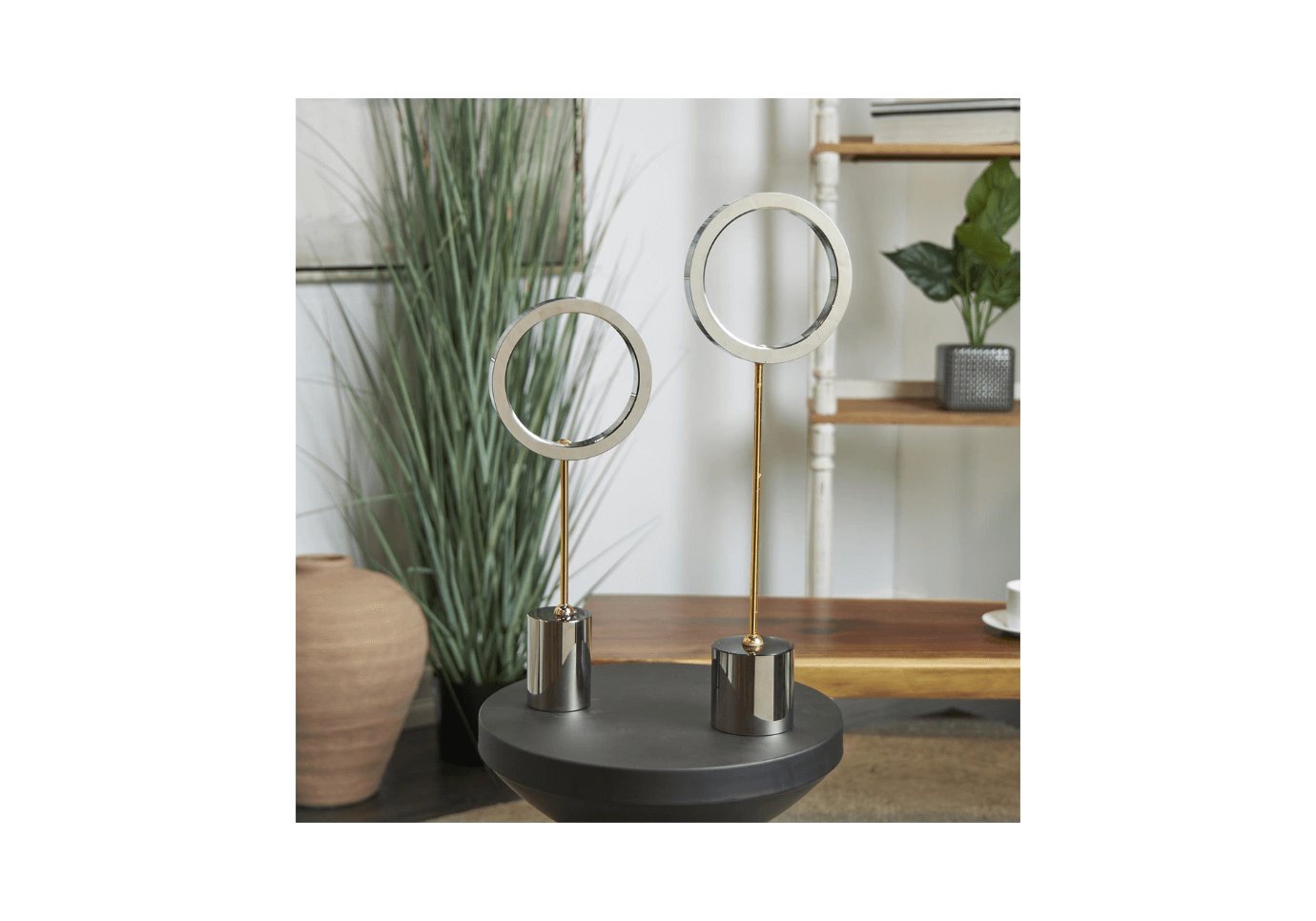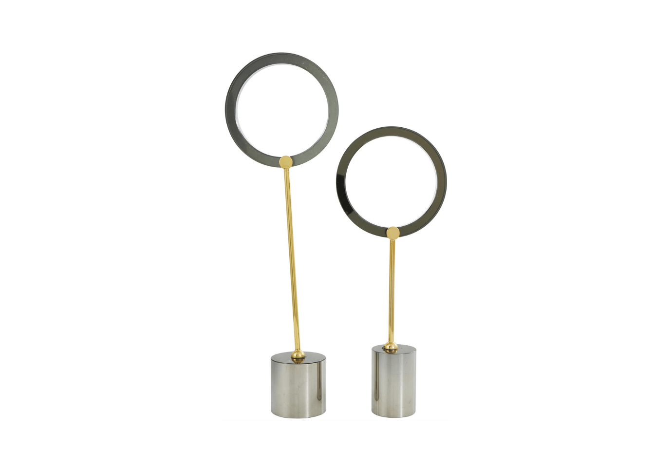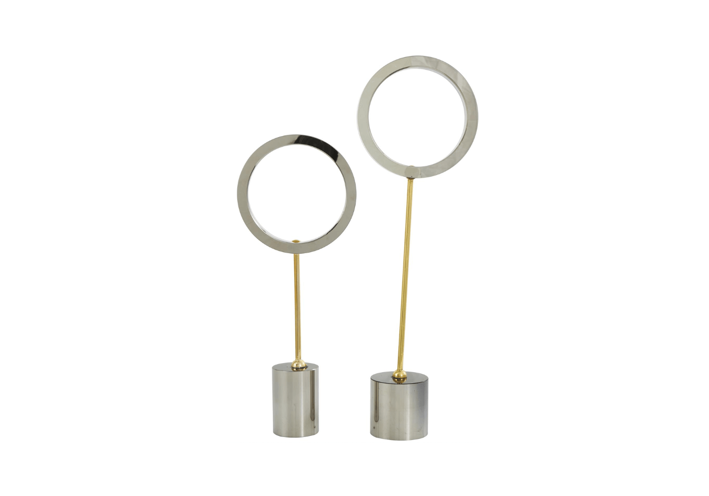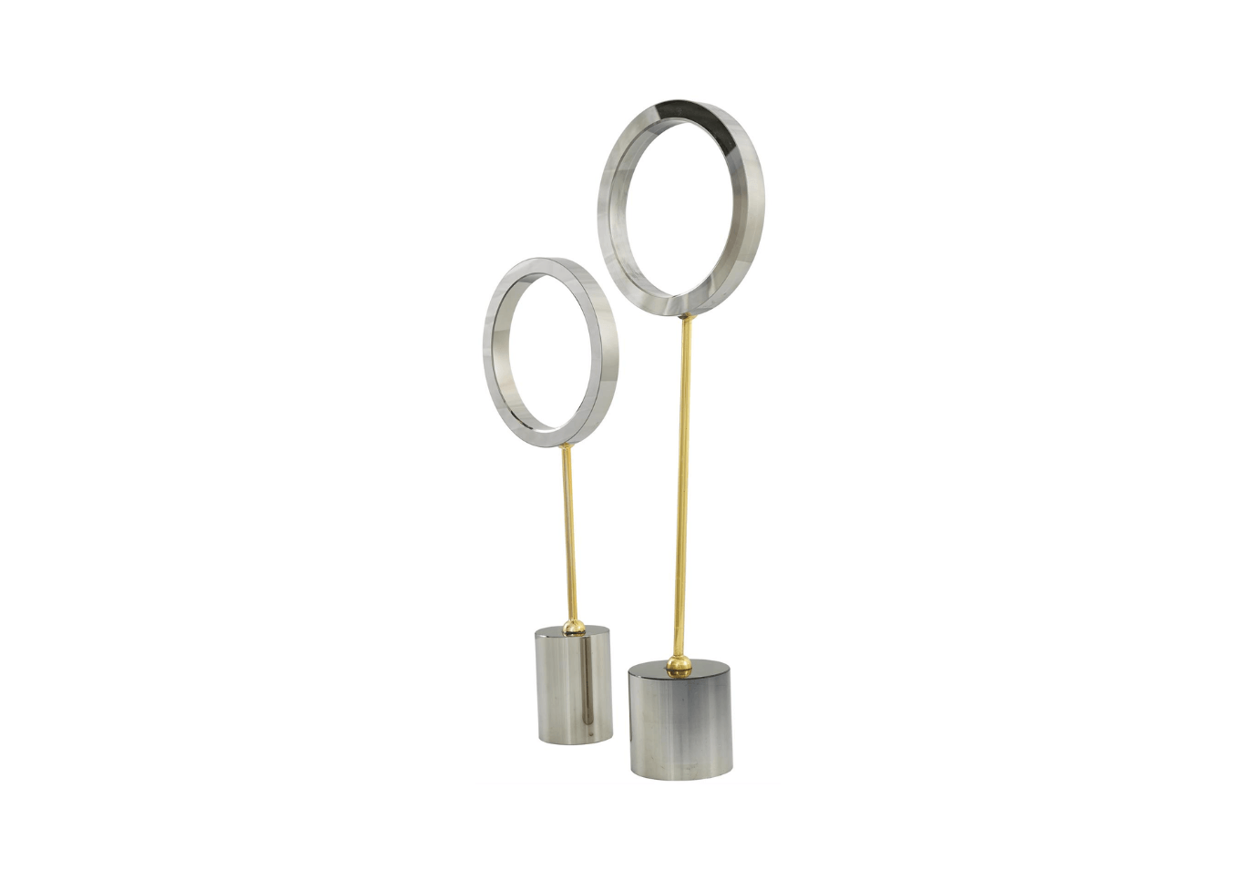 El acabado plateado brillante de estas esculturas de círculo abierto crea un impresionante contraste visual con sus delgados soportes dorados y sus bases de cristal transparente