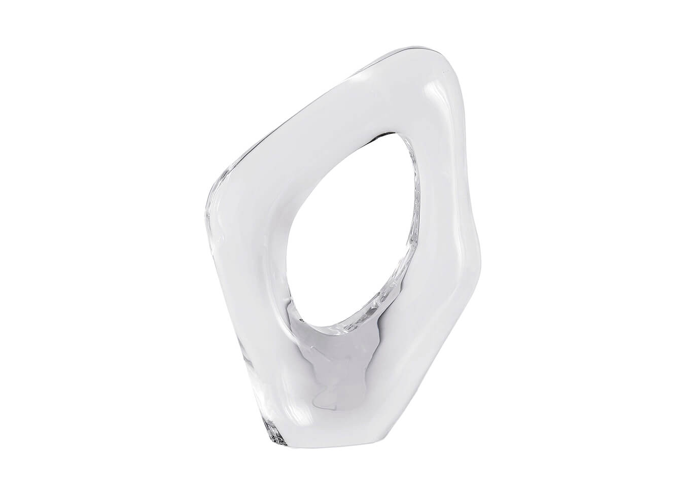 Escultura de forma orgánica suave en cristal transparente con hueco, de apariencia hielo.