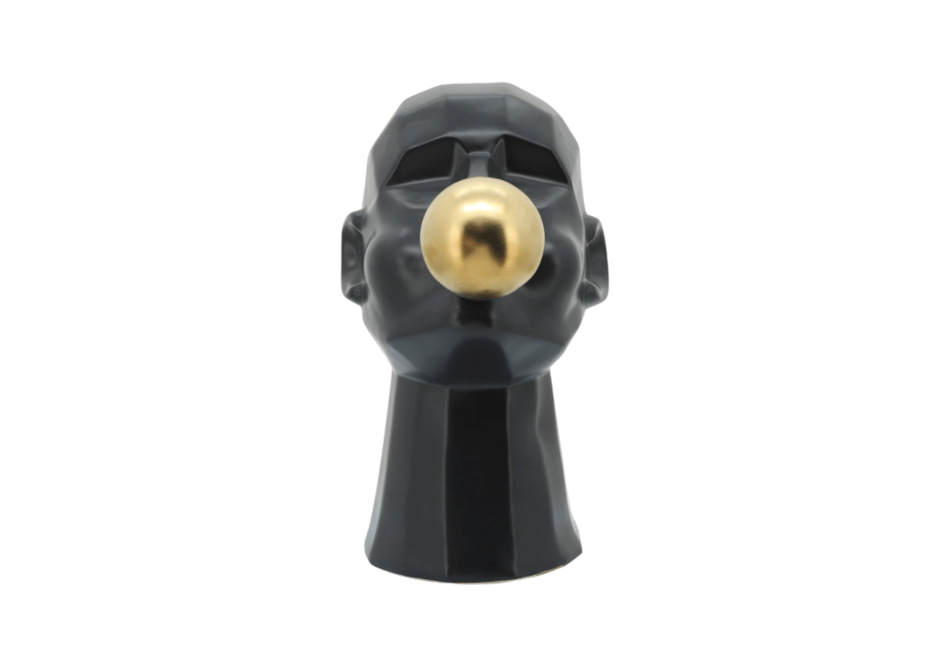 Esta escultura artística combina lo tradicional con lo contemporáneo, creando una pieza visualmente impactante. Fabricada en cerámica negra con un acabado elegante y sofisticado, presenta a un hombre soplando un globo de chicle en un vibrante dorado que contrasta armoniosamente con la cerámica oscura.