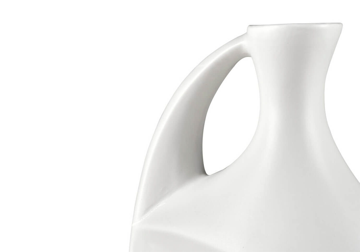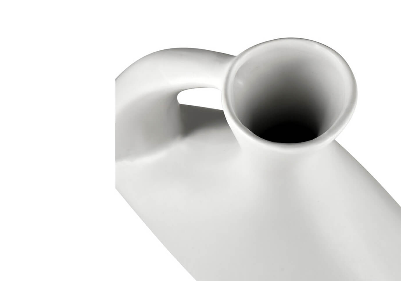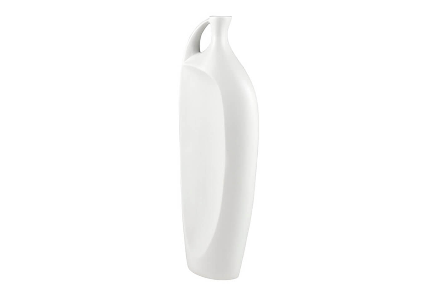 Forma de botella alargada de inspiración griega con un pequeño asa en la abertura y un detalle escultórico en un lateral. Con un acabado blanco satinado, el efecto es femenino y elegante.