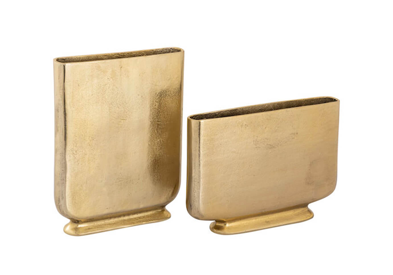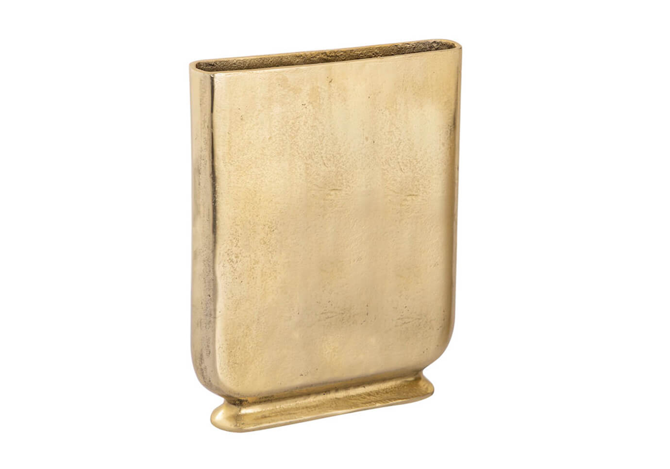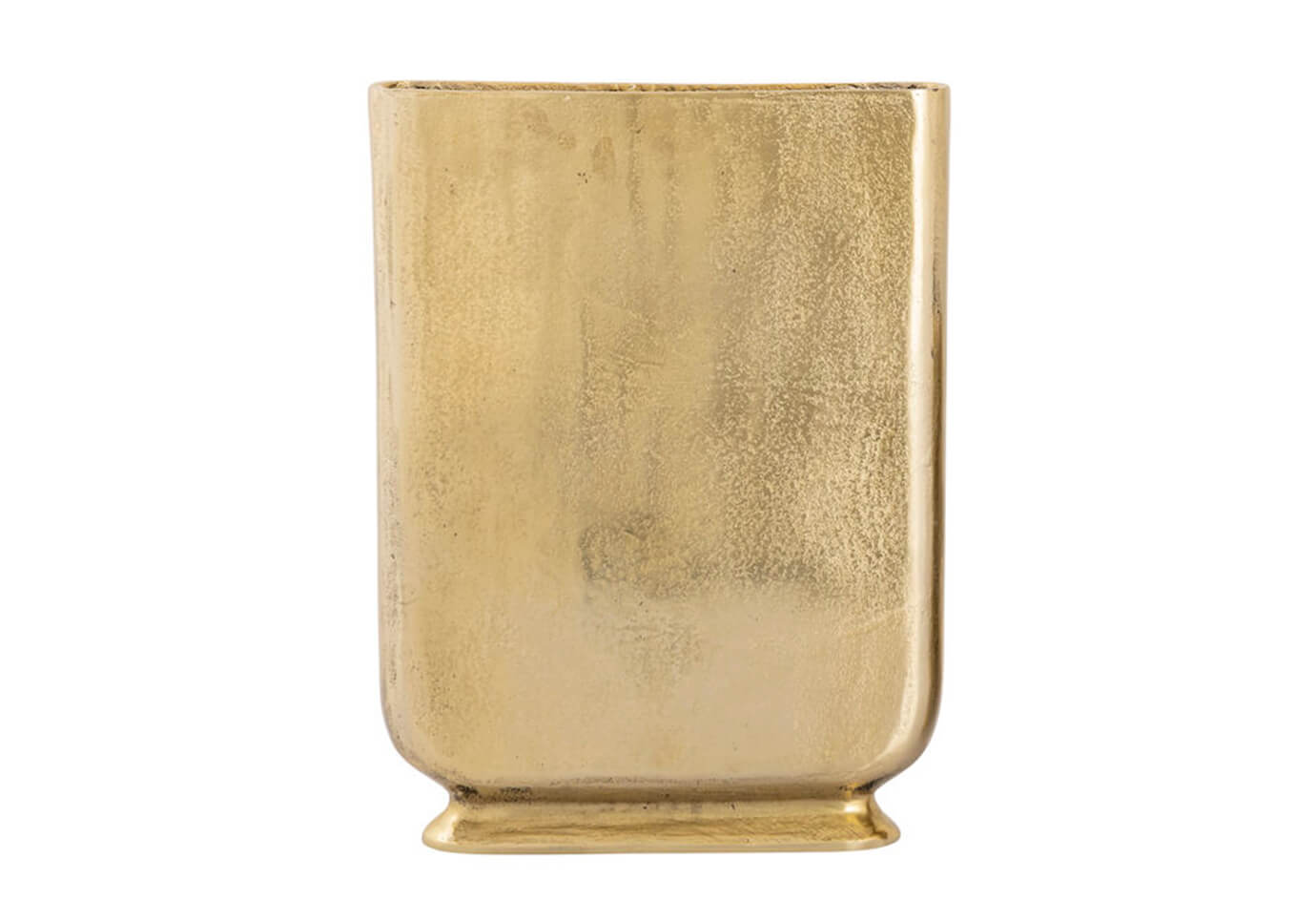 Florero alto y estrecho de aluminio con un acabado de latón texturizado. La forma se curva suavemente desde la base hacia una amplia boca rectangular. Este jarrón metálico es perfecto en una habitación de estilo tradicional actualizada.