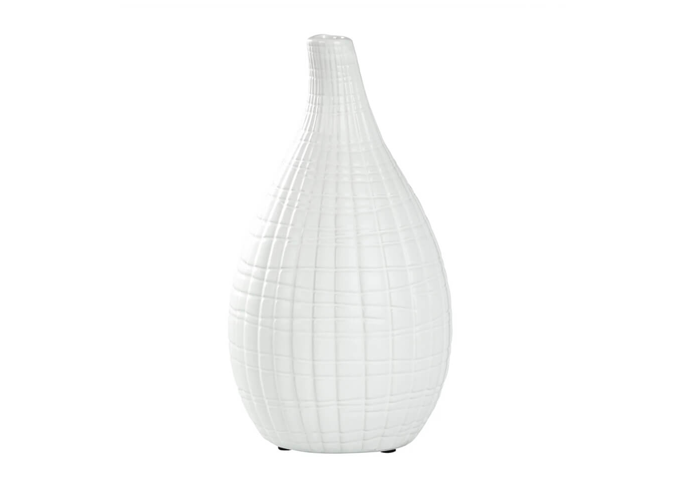 Florero de cerámica en forma de cebolla, textura de cuadros en acabado blanco mate.