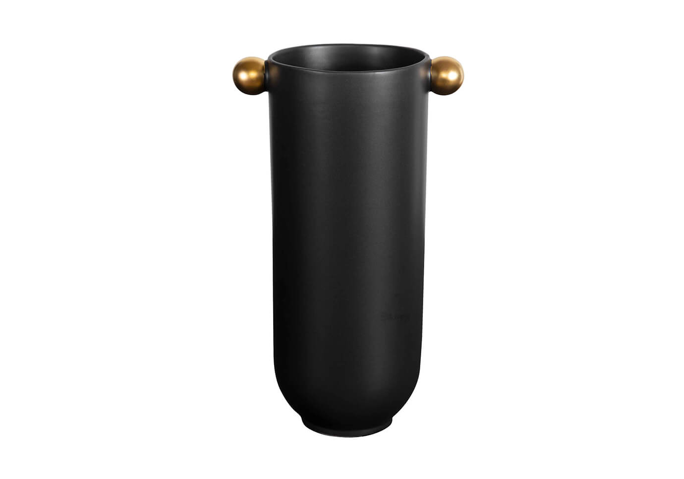Florero inspirado en la cerámica art déco. La pieza negra mate está acentuada por manijas esféricas color oro.