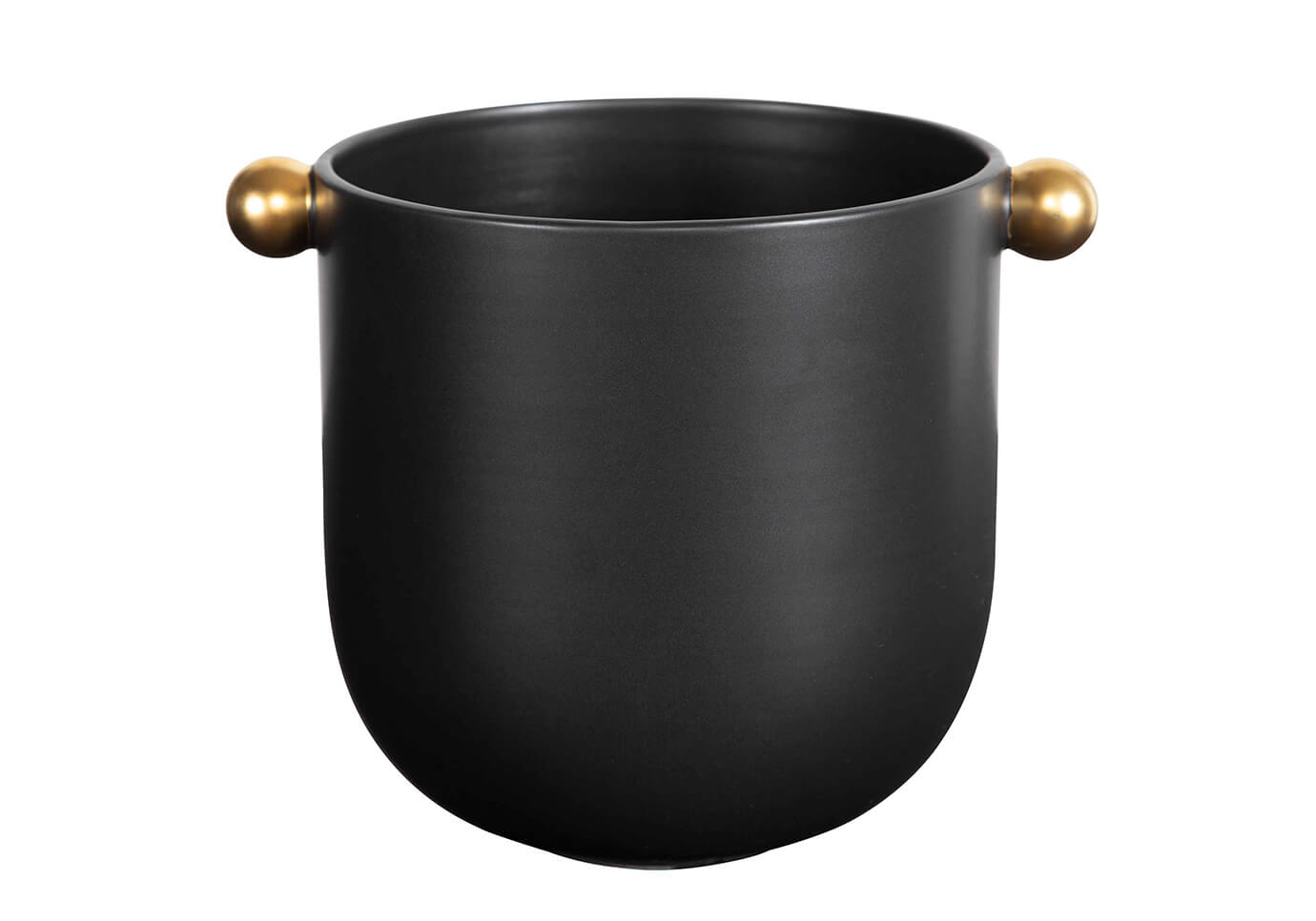 Florero inspirado en la cerámica art déco. La pieza negra mate está acentuada por manijas esféricas color oro.