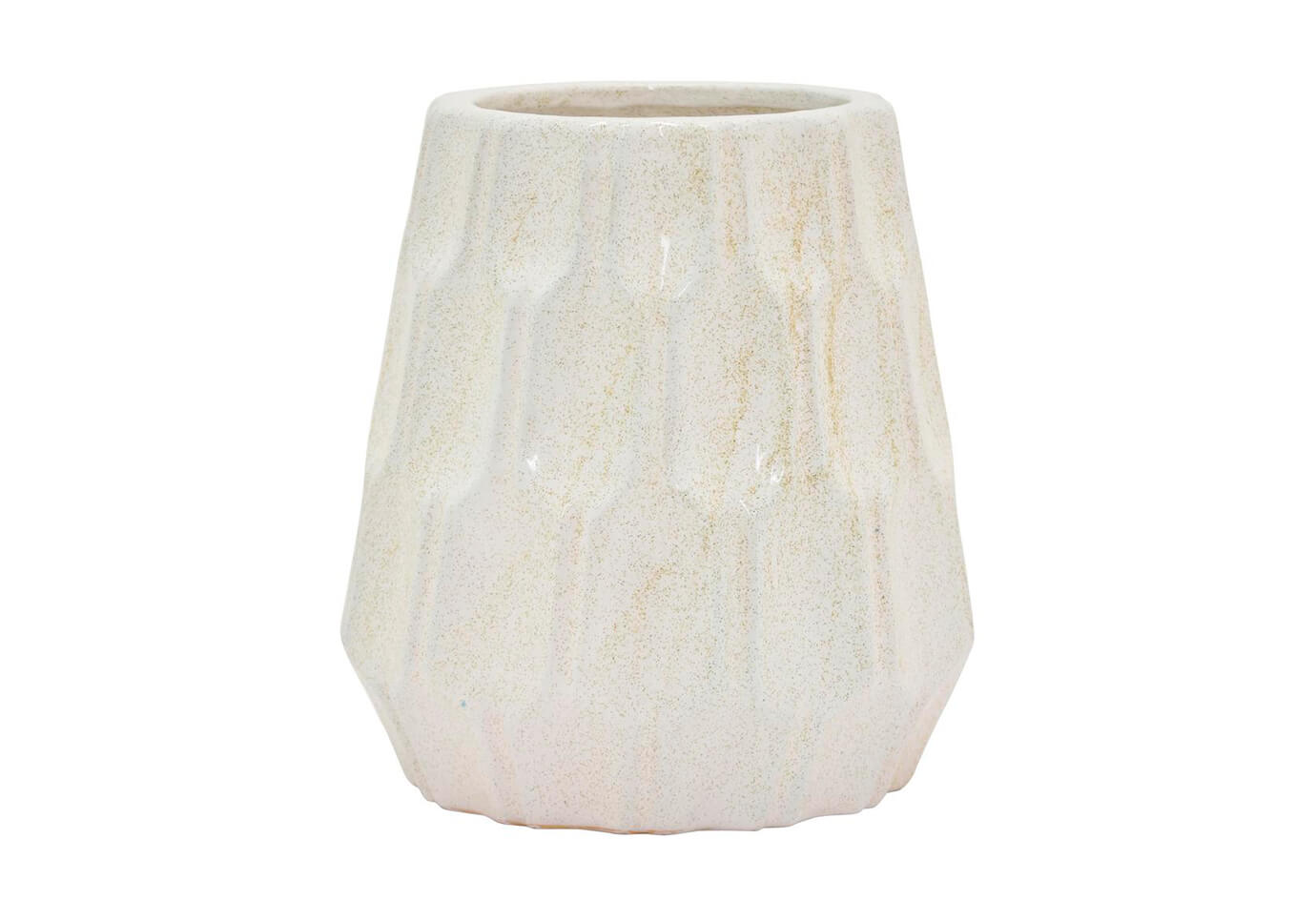 Florero de cerámica patrón panal acabado blanco con puntos arena dorada.