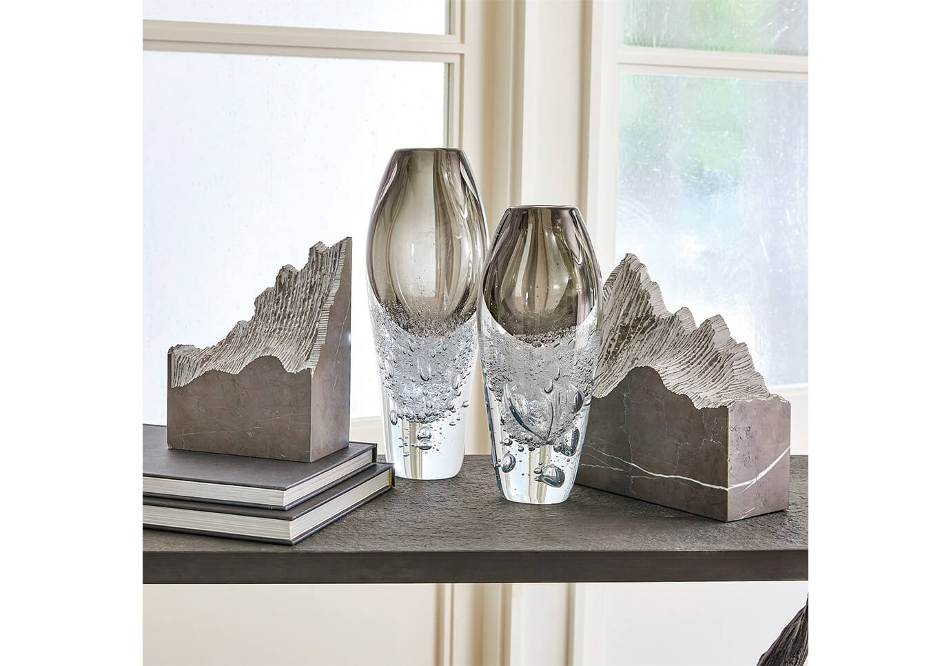Florero de cristal gota verde olivo, base translucida con burbujas. Este es un vaso de arte soplado a mano.