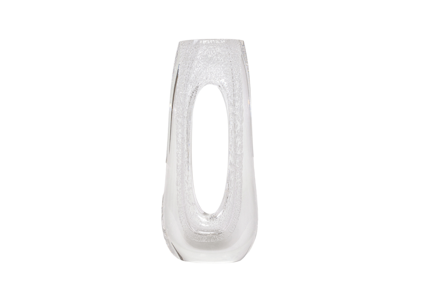 Las burbujas en el cristal agregan un aspecto visualmente interesante y dinámico a la pieza. El florero de cristal transparente con burbujas y hueco es una elección sofisticada para aquellos que buscan agregar un toque de estilo y distinción a su hogar u oficina. Su diseño único y su calidad artesanal lo convierten en una pieza llamativa