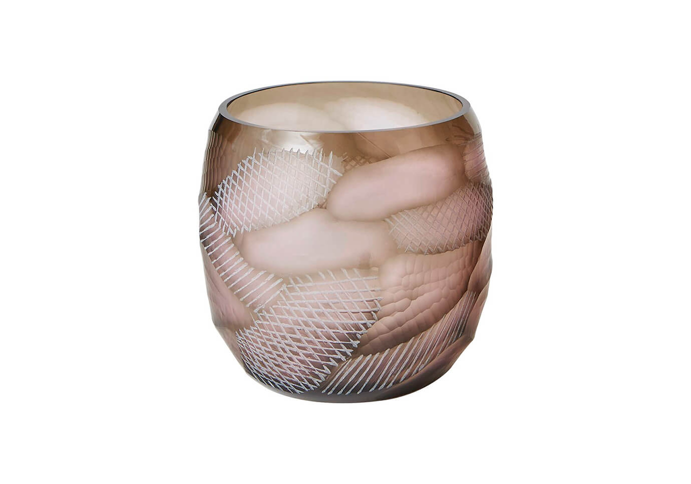 Florero de vidrio redondo color morado transparente con diseño de óvalos mate.