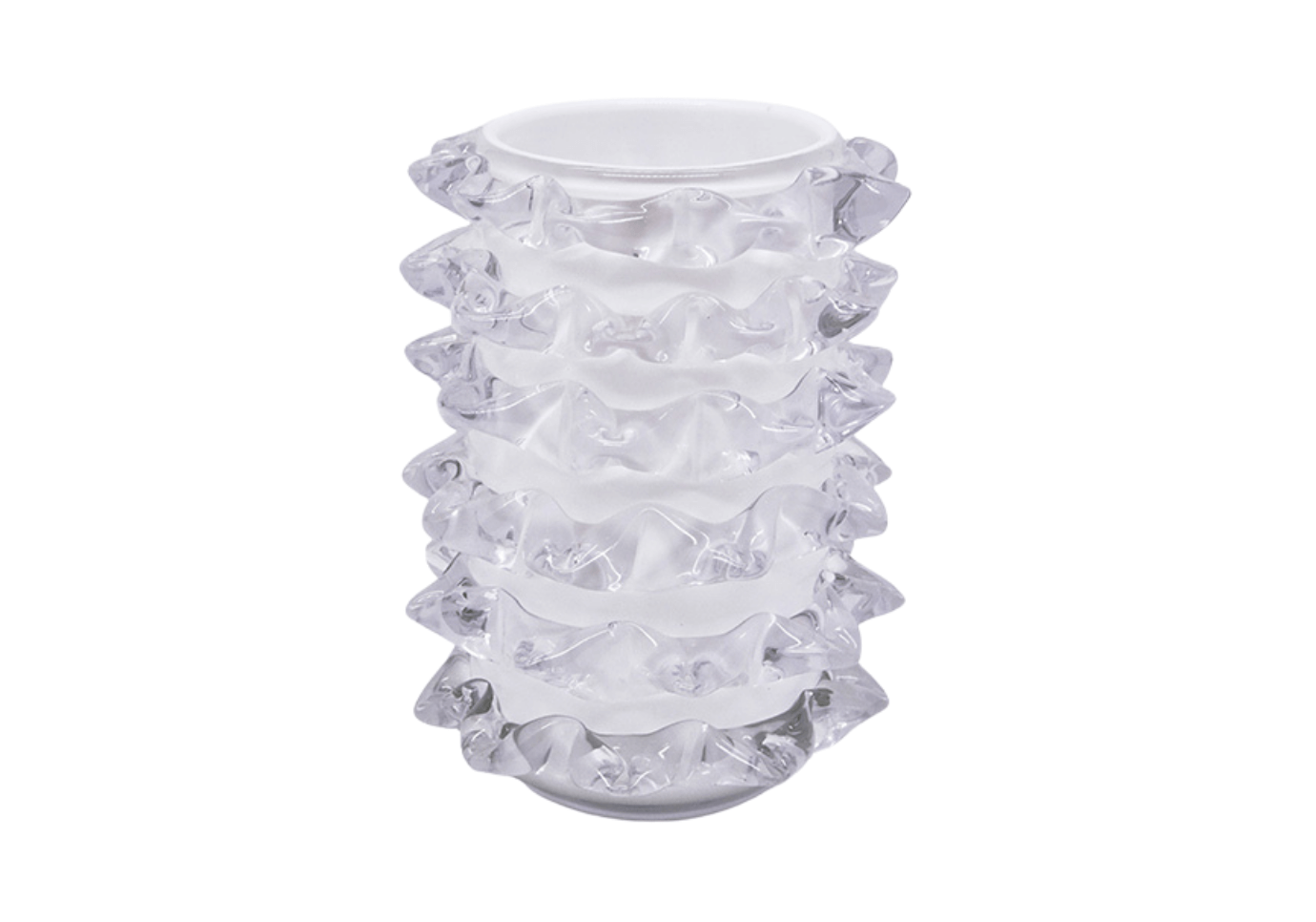 Florero de lujo fabricado en cristal blanco de alta calidad, decorado con un distintivo diseño de picos transparentes que le otorgan un carácter elegante y contemporáneo. Perfecto para complementar espacios sofisticados con un toque artístico.