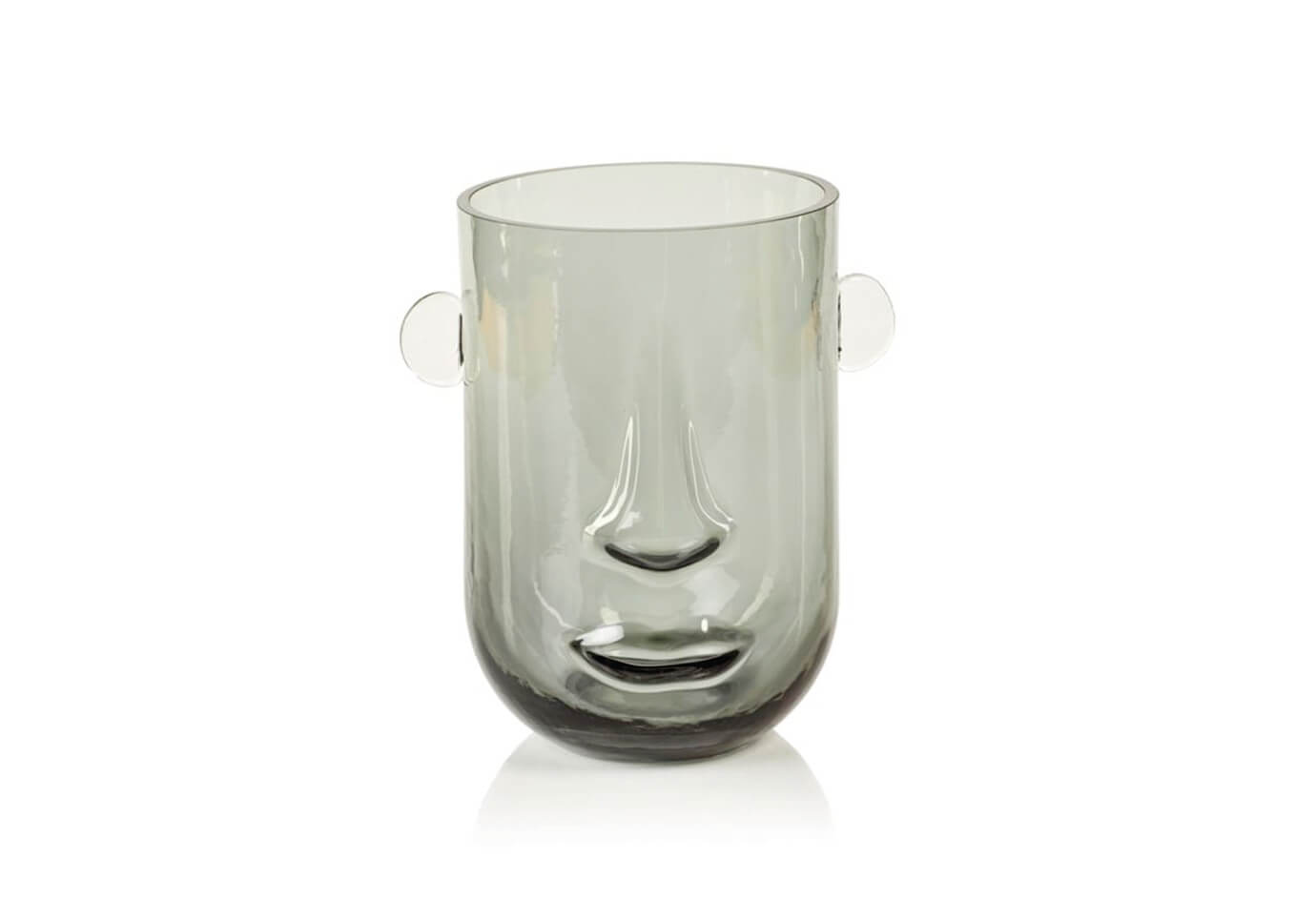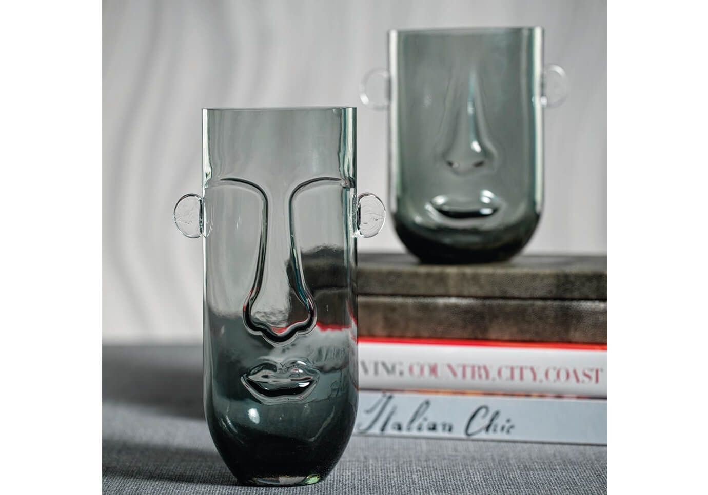 Florero redondo de vidrio humo negro diseño de una cara con orejas sobresalientes.