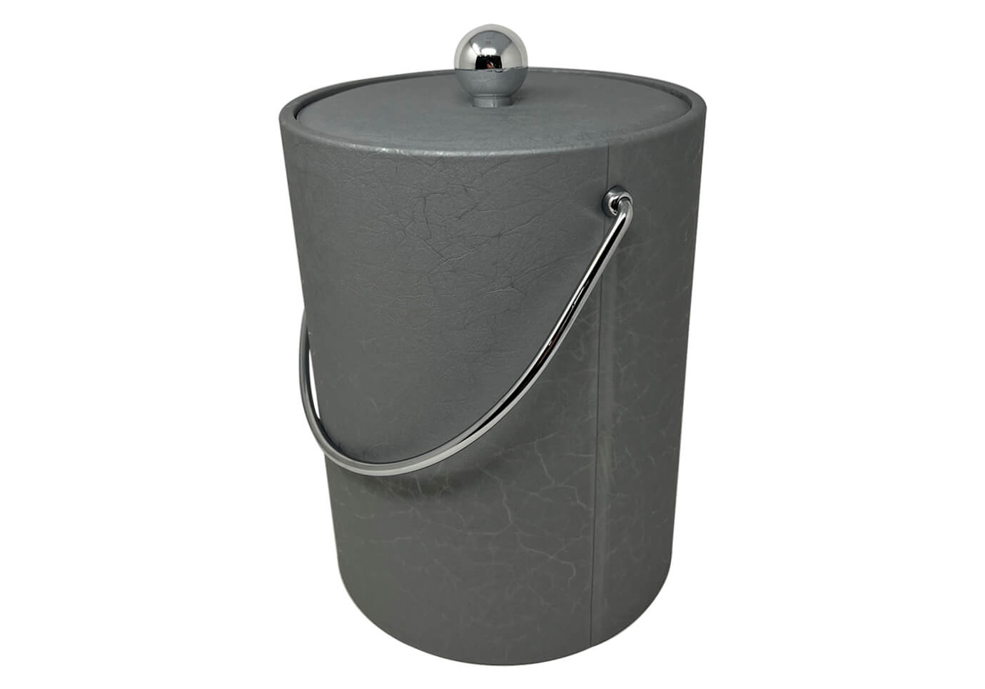 Hielera recubierta en vinipiel color gris de diseño craquelado satinado, tapa forrada aislante con agarradera de bolita y asa plateado brillante. Nuestra hielera aislada es más que una gran hielera, es perfecto para refrescar vino, champán, refrescos o incluso para servir papas fritas, dulces y pretzels.