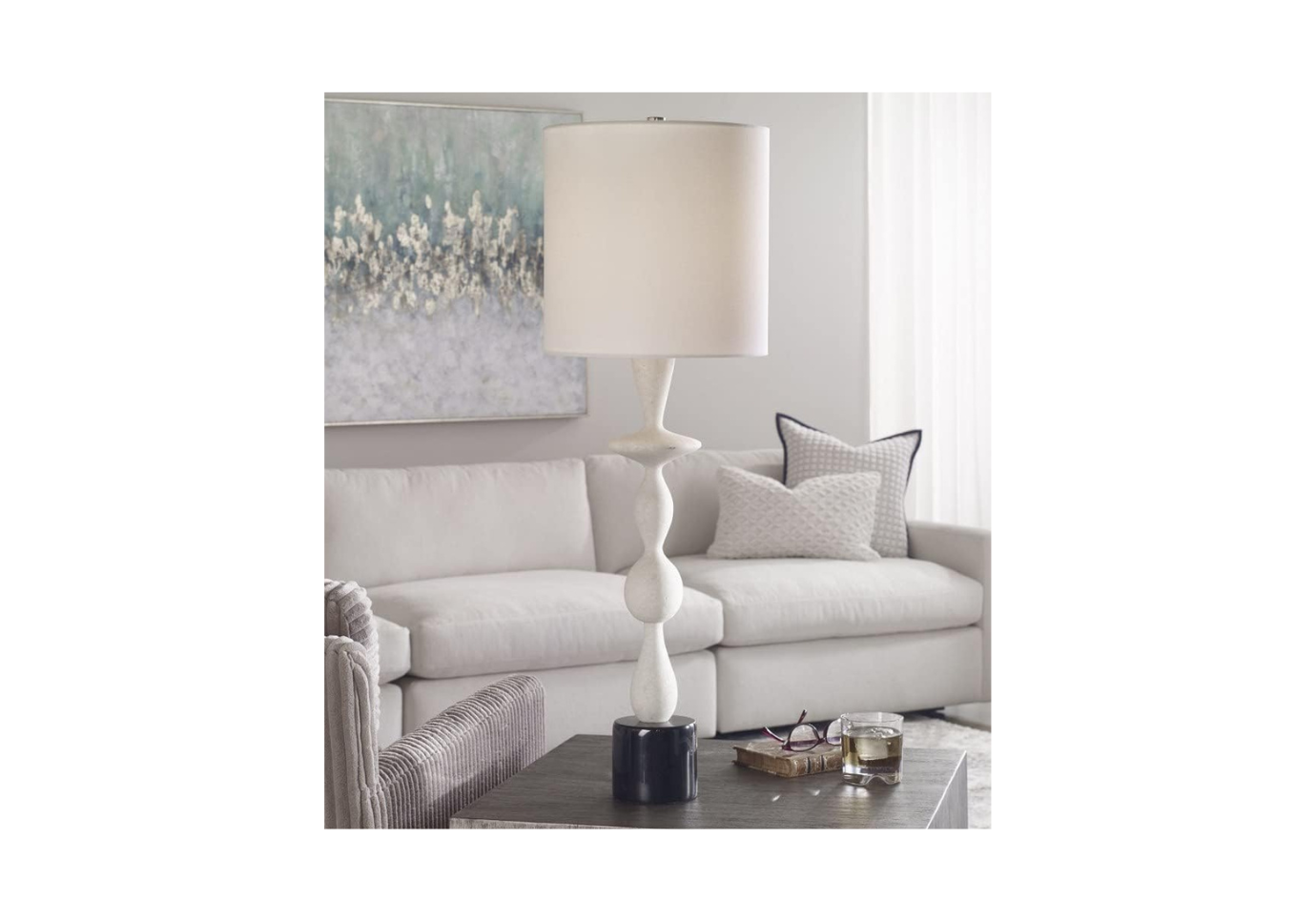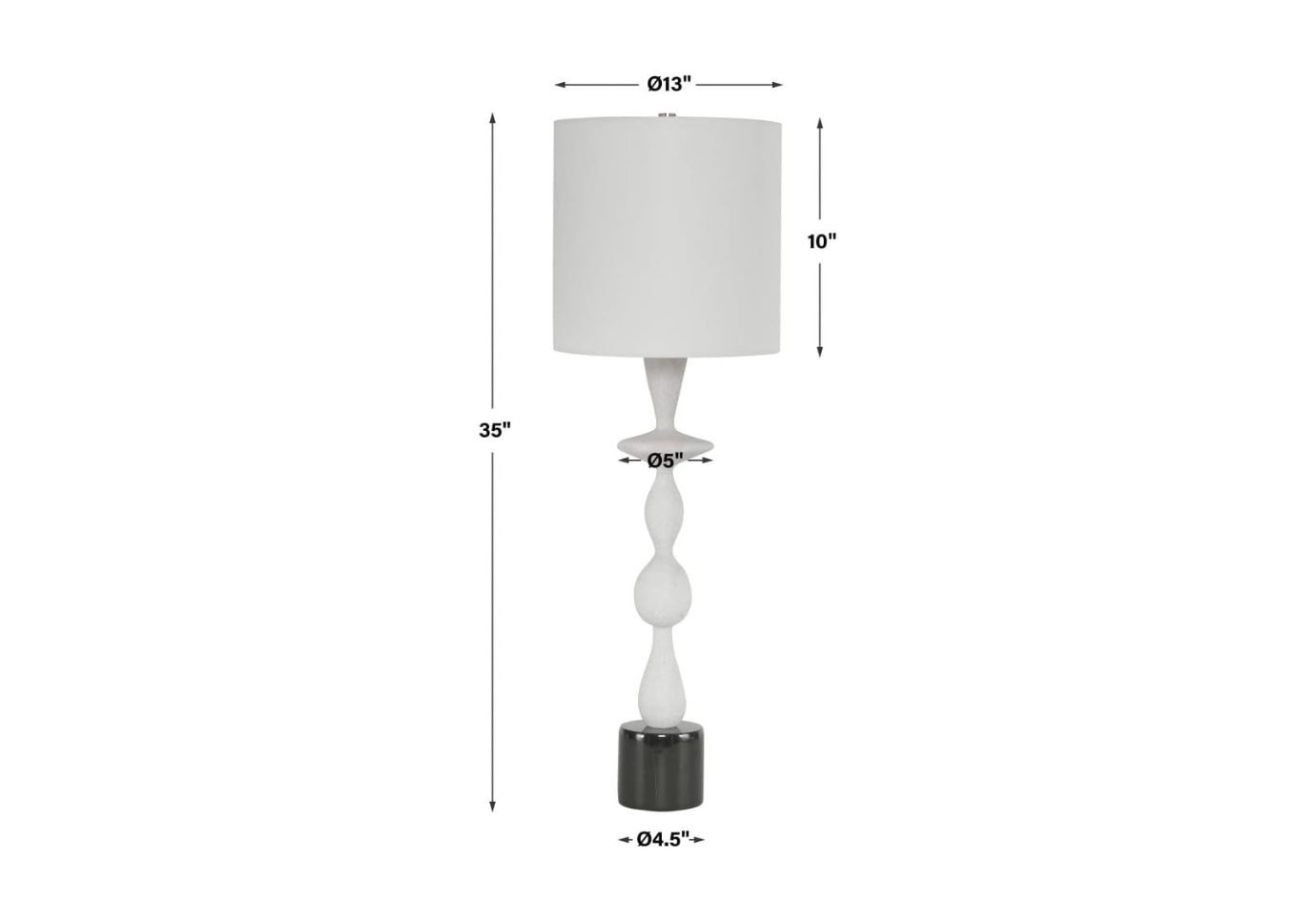 Añade un toque de elegancia a tus espacios con esta sofisticada lámpara de mesa. Su diseño presenta una estructura de marmolina con detalles en óvalos, complementada por una base de mármol negro que aporta estabilidad y estilo. Ideal para salas, estudios o dormitorios modernos.