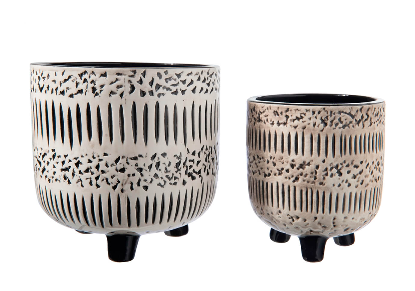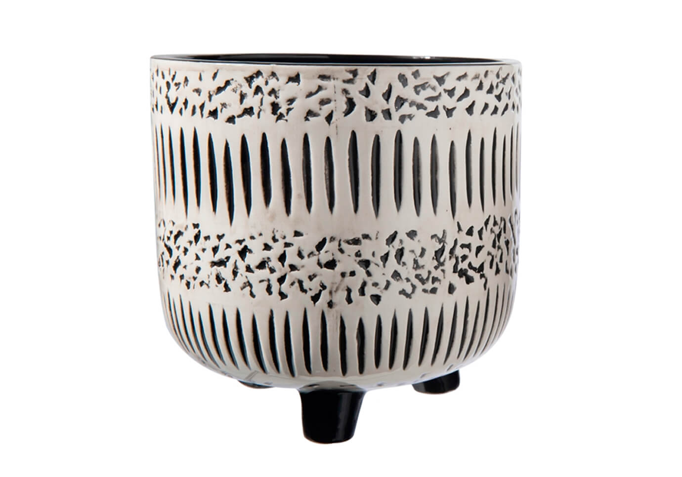 Maceta redonda de cerámica blanca textura tribal color negro base trípode negras.
