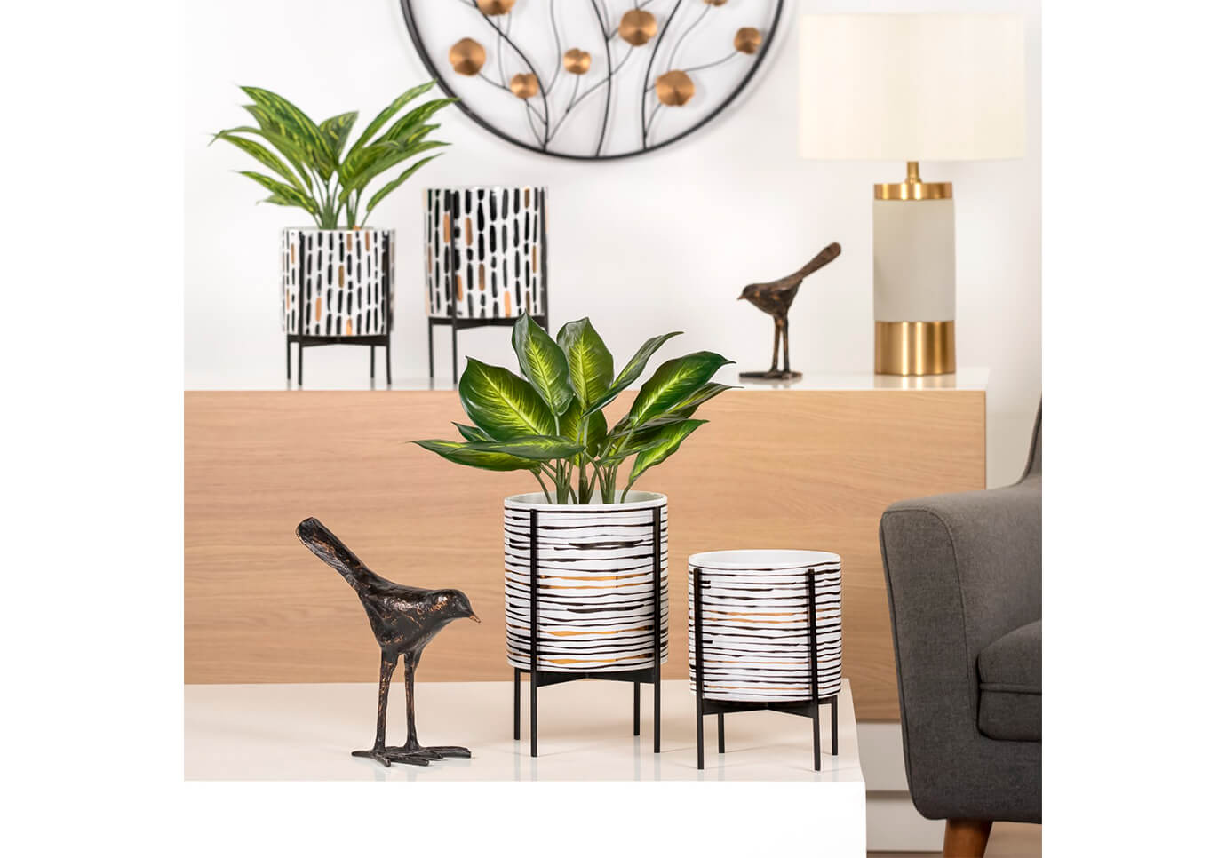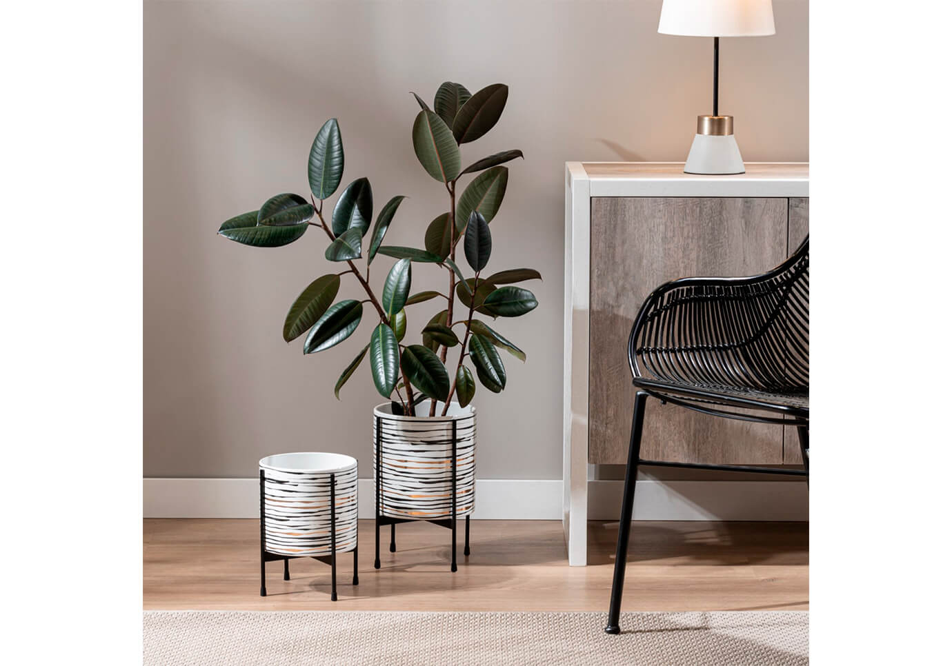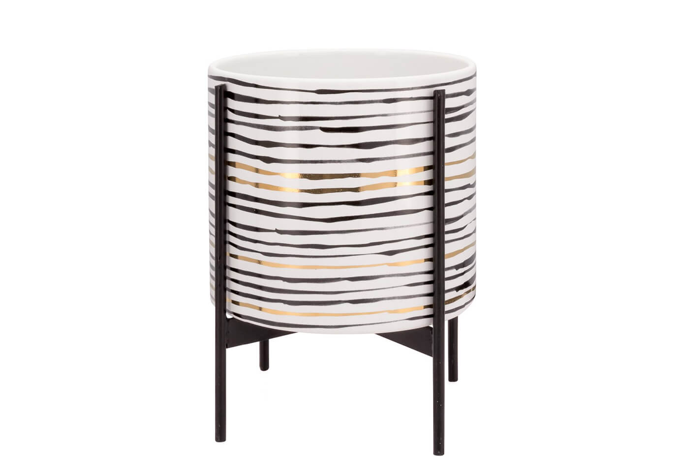 Maceta redonda cerámica blanca, líneas negras y dorado con base de acero de cuatro puntos.