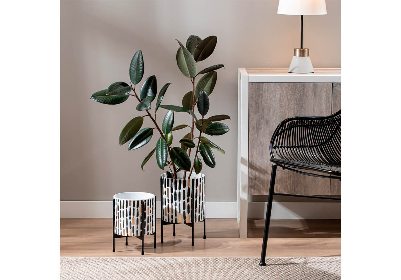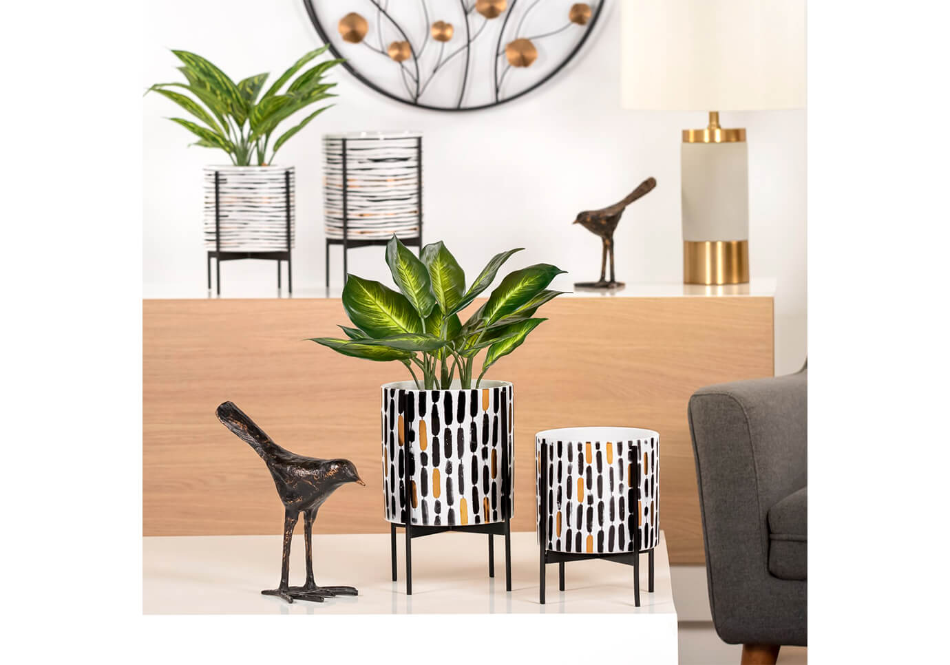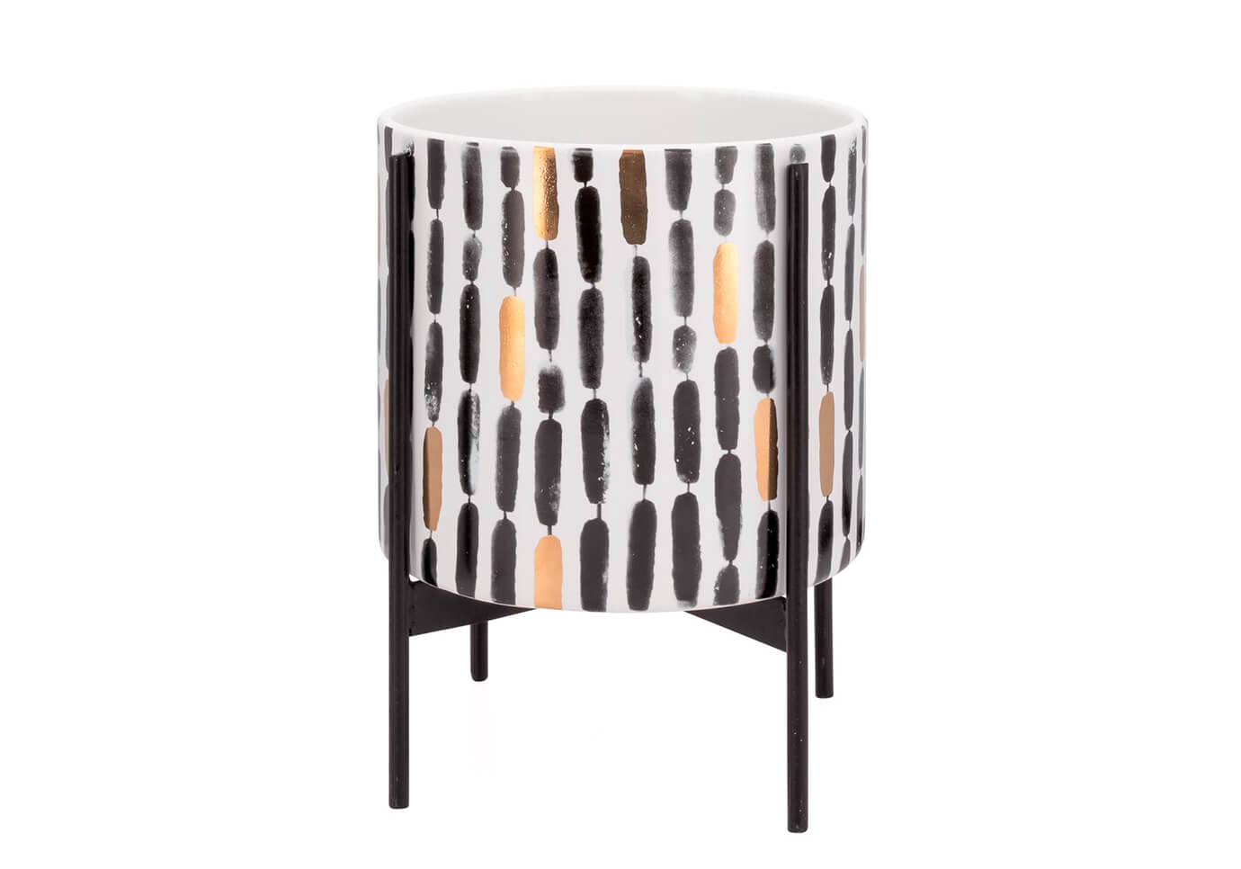 Maceta redonda cerámica blanca, líneas negras y dorado con base de acero de cuatro puntos.