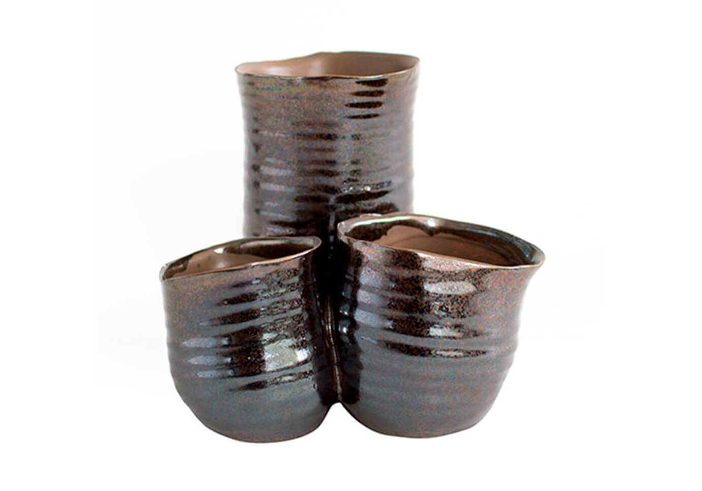 Maceta pequeña de cerámica con tres espacios, pintada en color café brillante de apariencia tornasol.