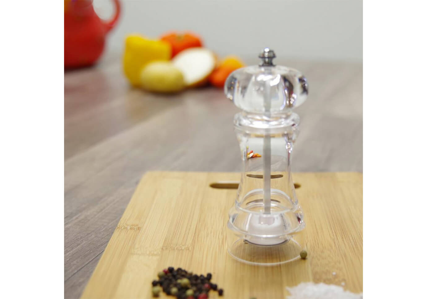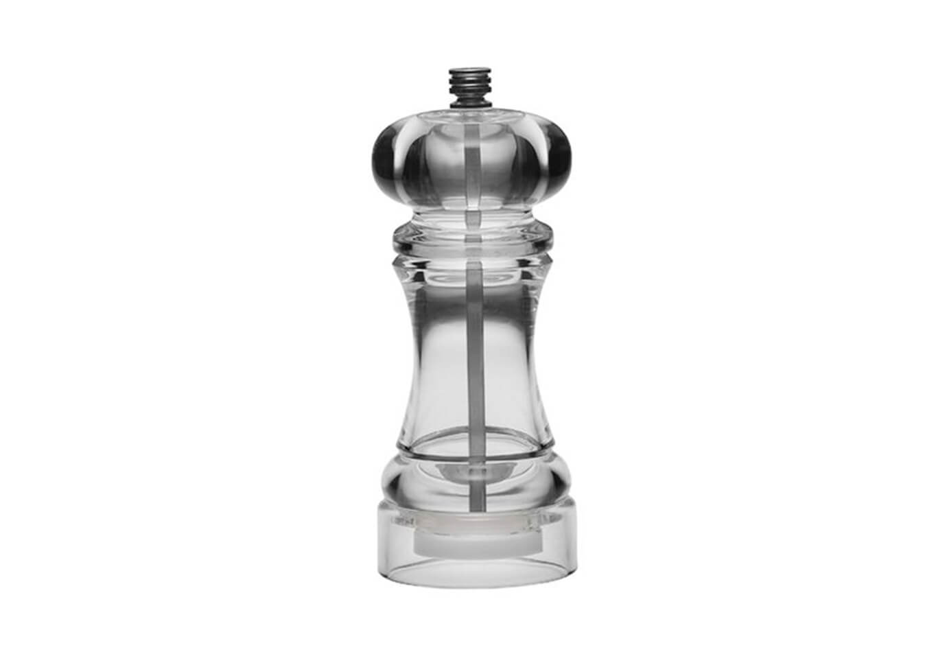 Moledor de sal o pimienta de acrílico transparente diseño circular acinturado chico.