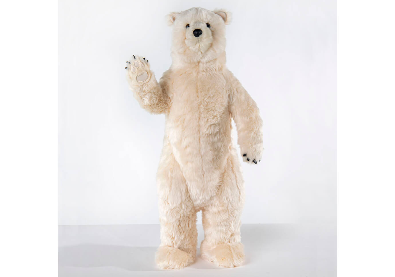 Oso polar beige claro, pelaje sintético suave, parado en dos patas fijas, cabeza fija y patas superiores móviles.