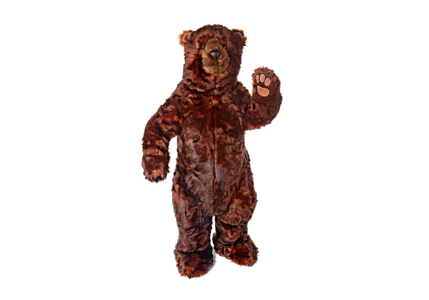 Oso de peluche café pelo sintético suave parado en dos patas, brazos móviles.